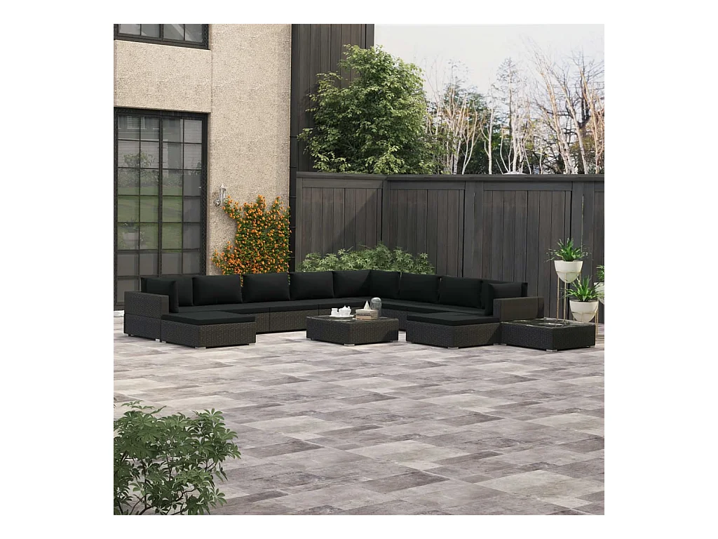 11-tlg. Garten-Sofagarnitur mit Kissen Schwarz Poly Rattan