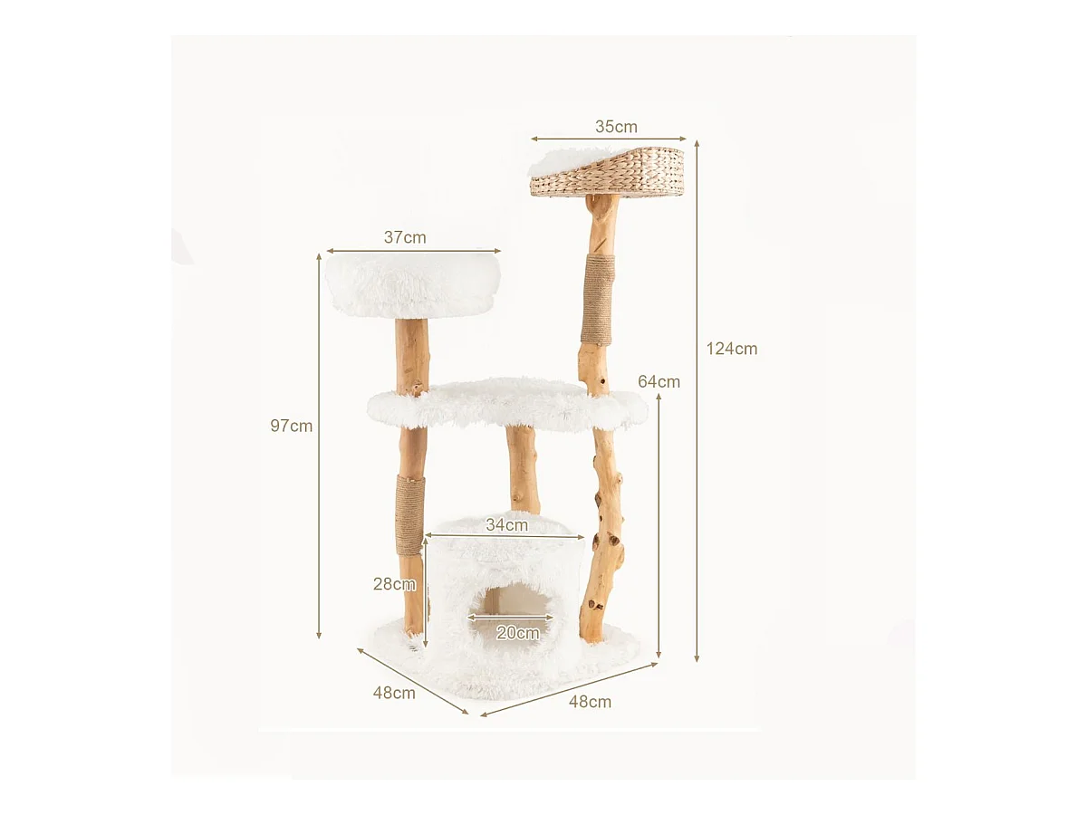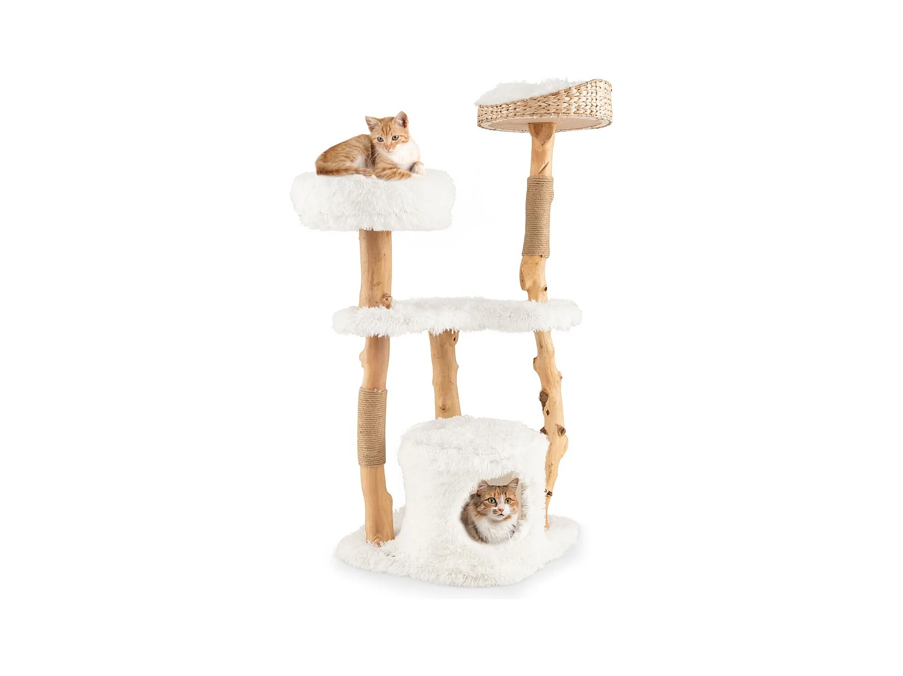124 cm Kratzbaum aus Holz mit Katzenhöhle & Plüschsitzfläche & Sitzplattform Kratzpfosten aus Jute