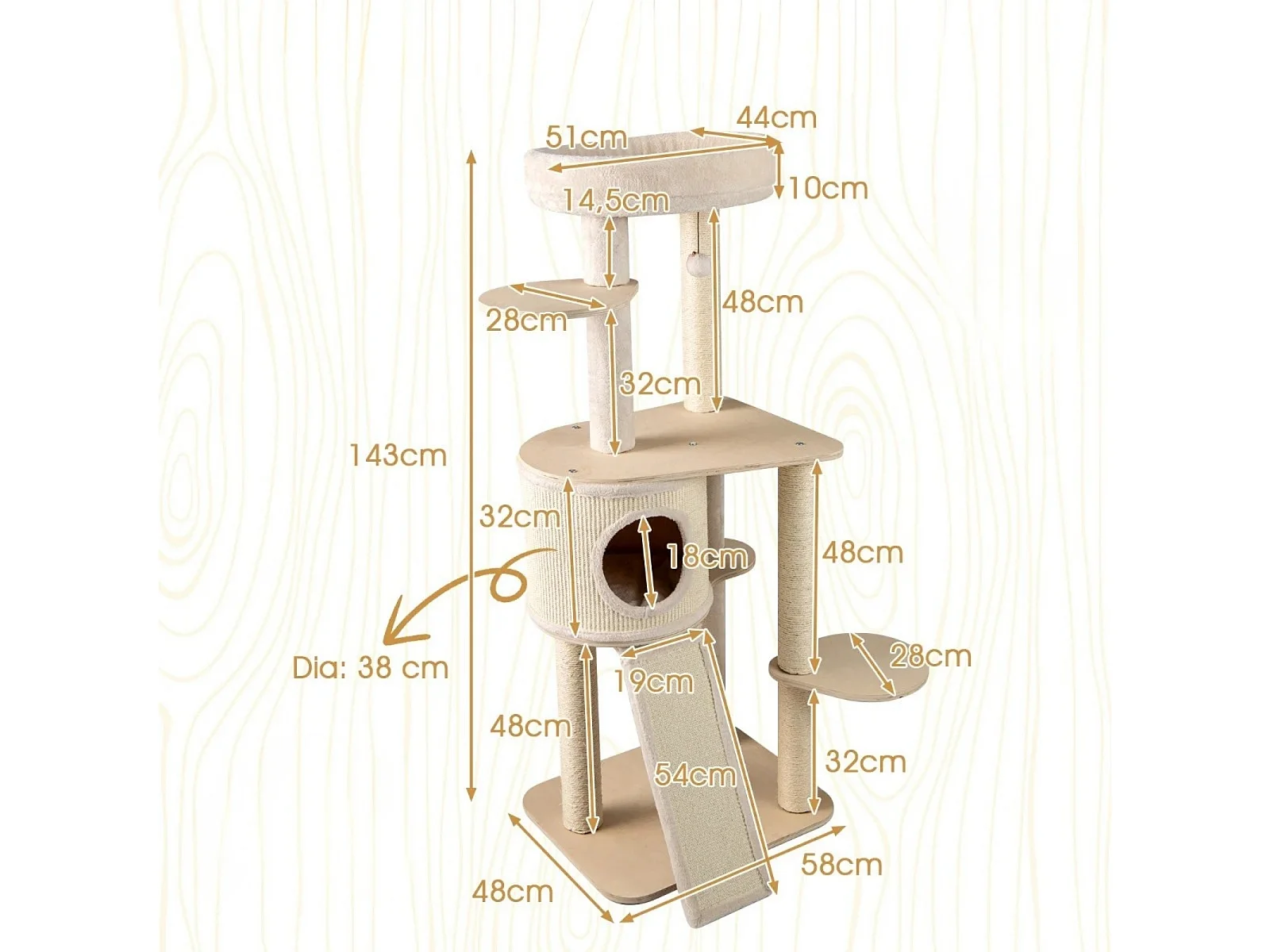 143 cm Holz Kratzbaum mit Kratztonne & Sisal-Kratzsäulen & Leiter Katzenbaum Kletterbaum Natur