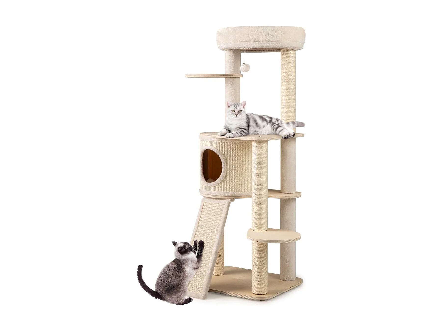 152 cm Kratzbaum mit 2 Katzenhöhlen & Korb & Sisal-Kratzpfosten & Spielball Katzenbaum Kletterbaum