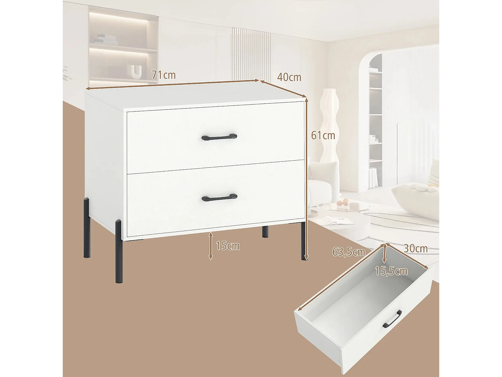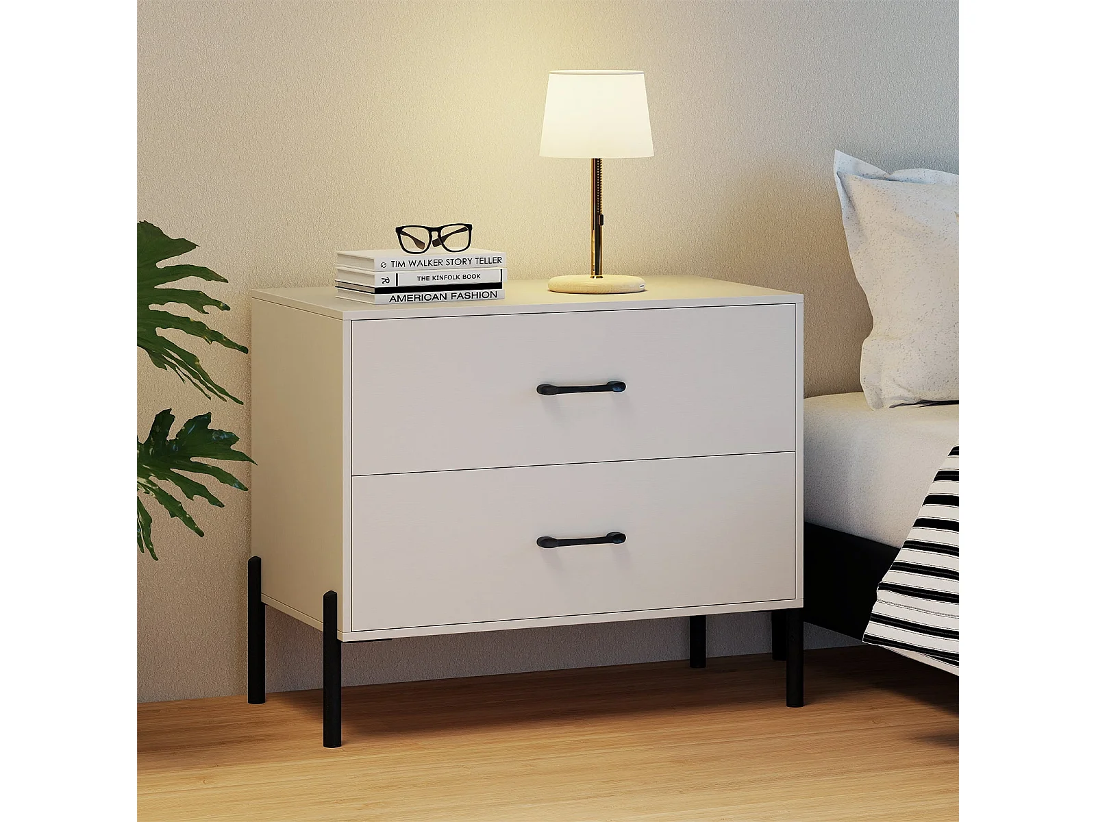 2-Schubladen-Kommode moderner Nachttisch aus Holz mit Metallbeinen & Griffen kompakter Beistelltisch Weiß