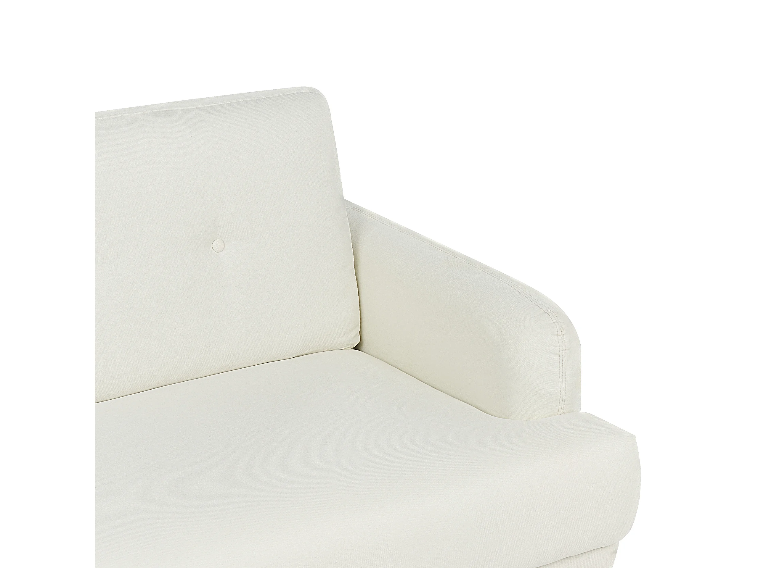 2-Sitzer Sofa Stoff weiß mit hohen Holzbeinen Armlehnen Knöpfe Retro Stil Tuve