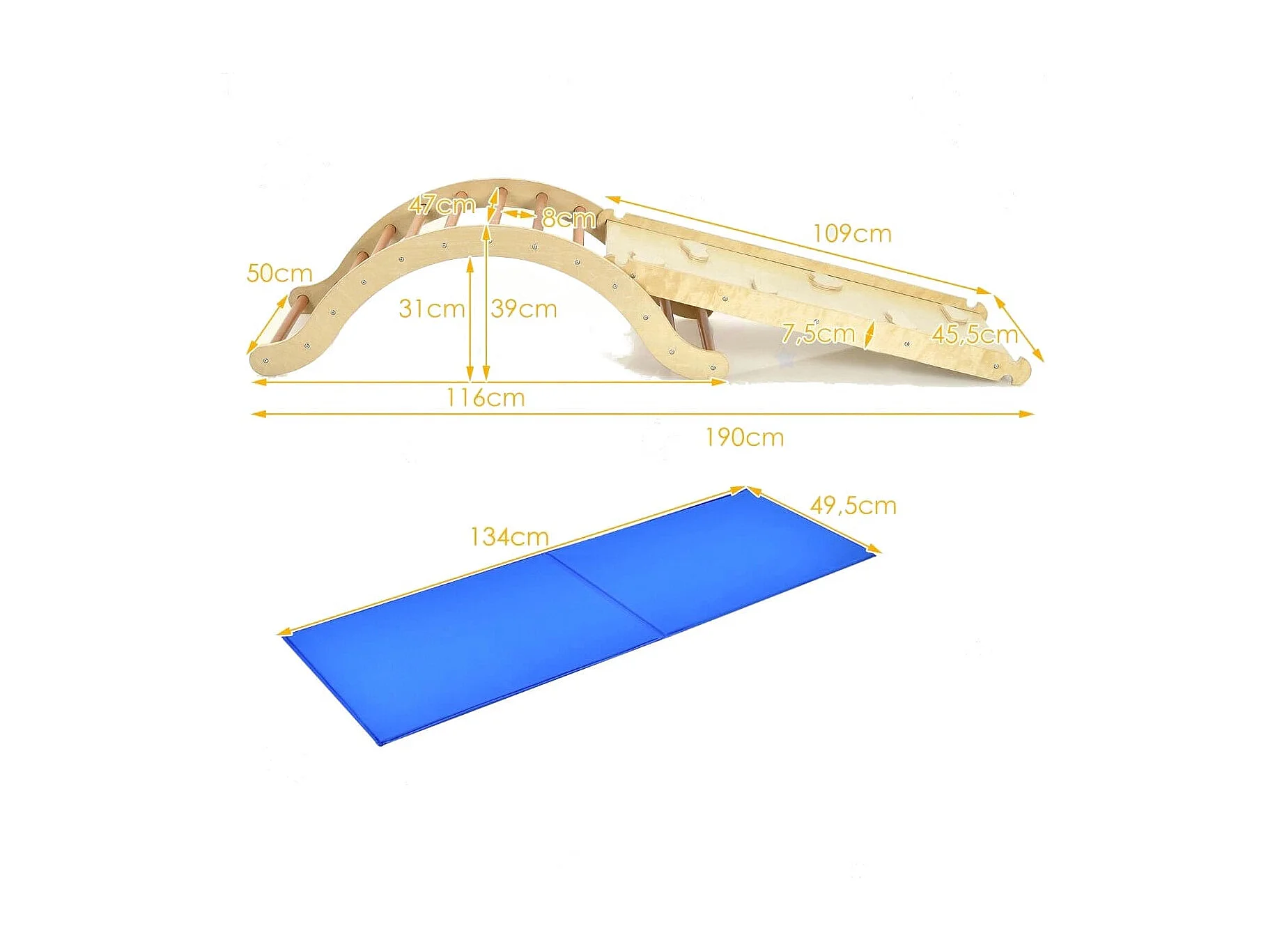 3 in 1 Kinder Kletterleiter Set mit Umkehrbarer Rampe und Kissen zum Klettern und Rutschen Natur + Blau Tragfähigkeit von 60kg