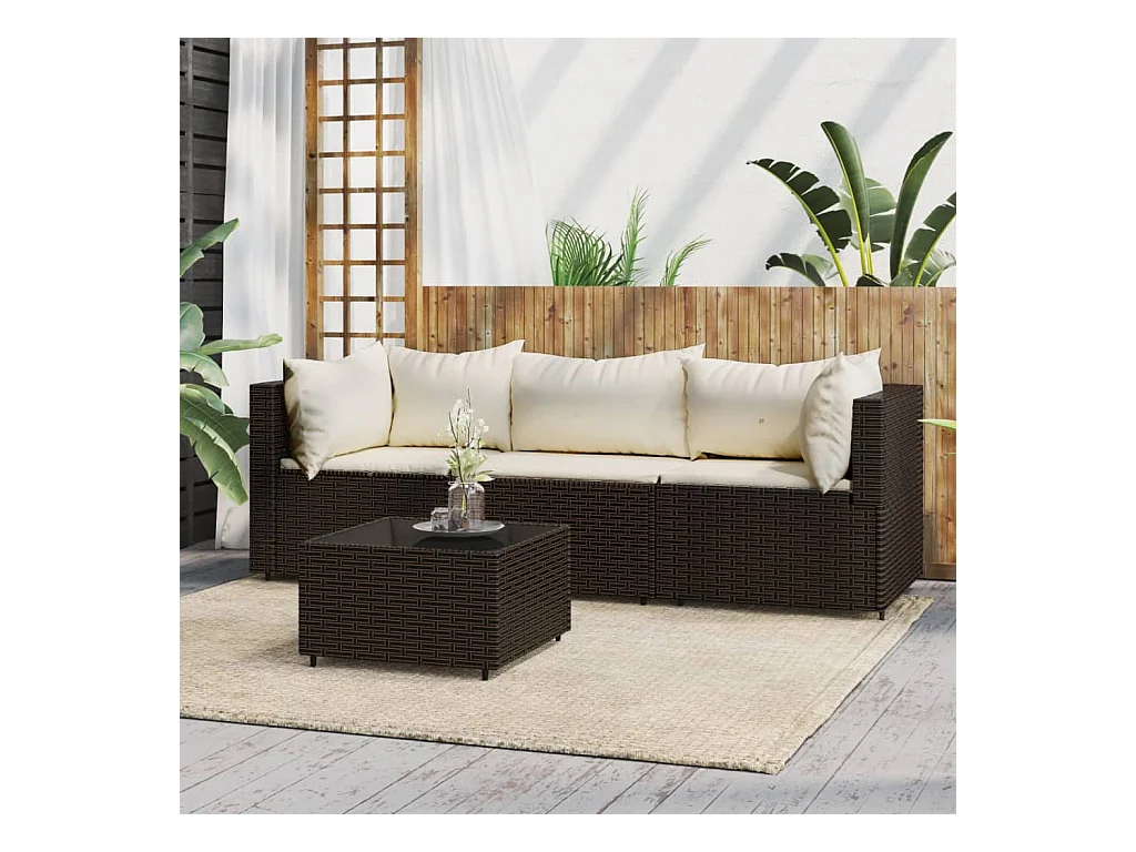 4 Stück Gartenmöbel mit braunen Kissen aus Kunstharzgeflecht