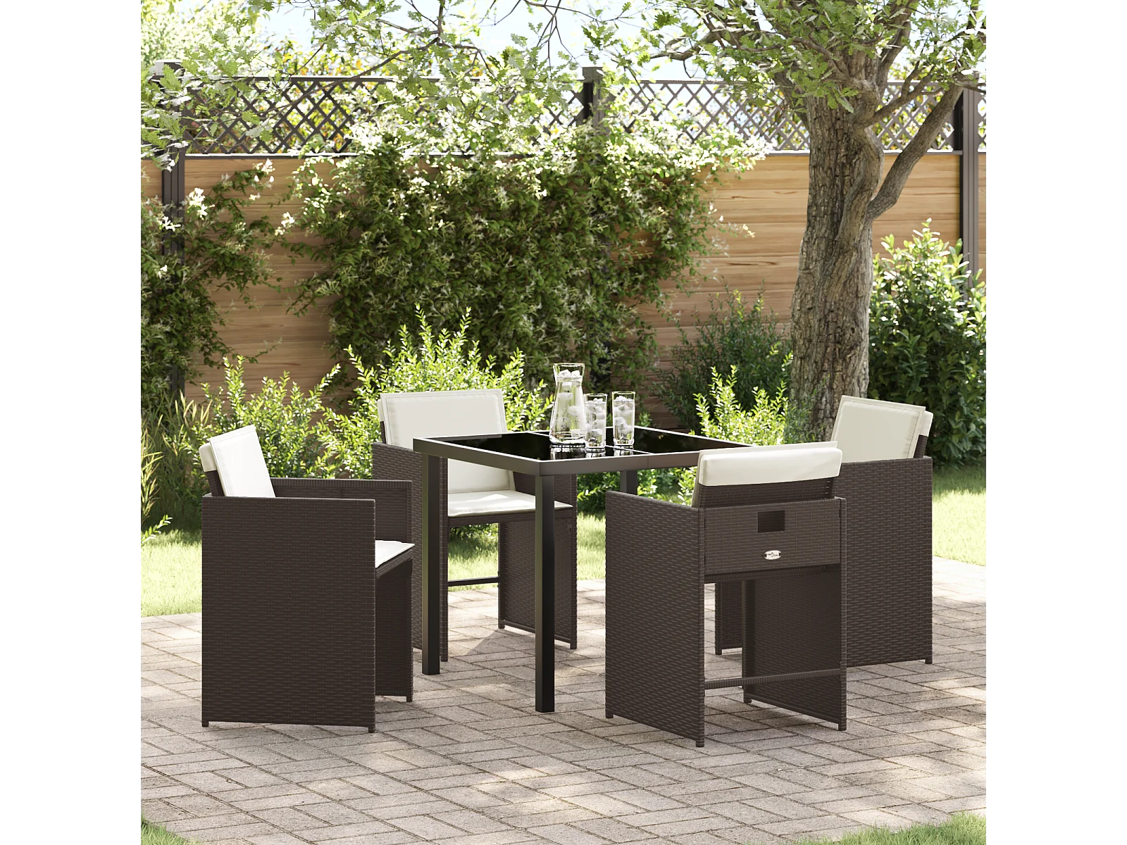 5-teiliges Garten-Essset mit braunen Polyrattan-Kissen
