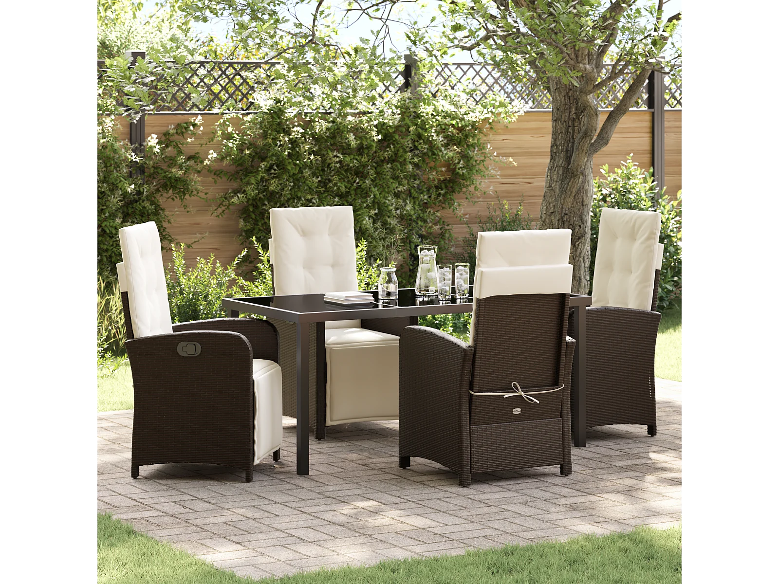 5-teiliges Garten-Essset mit braunen Polyrattan-Kissen