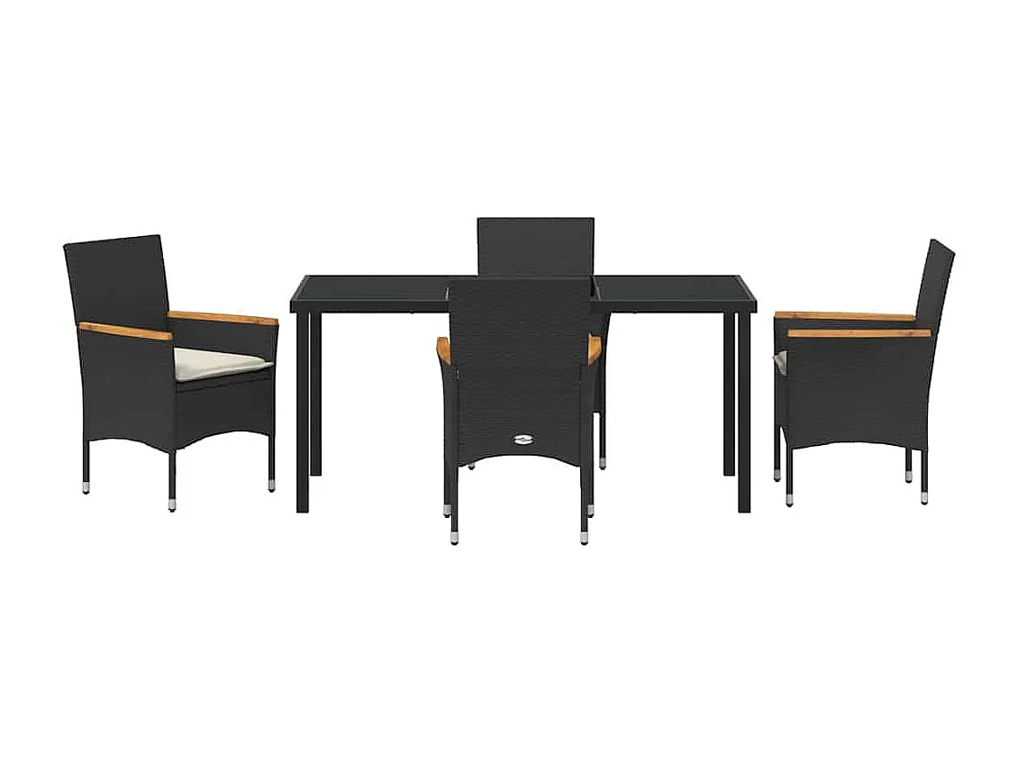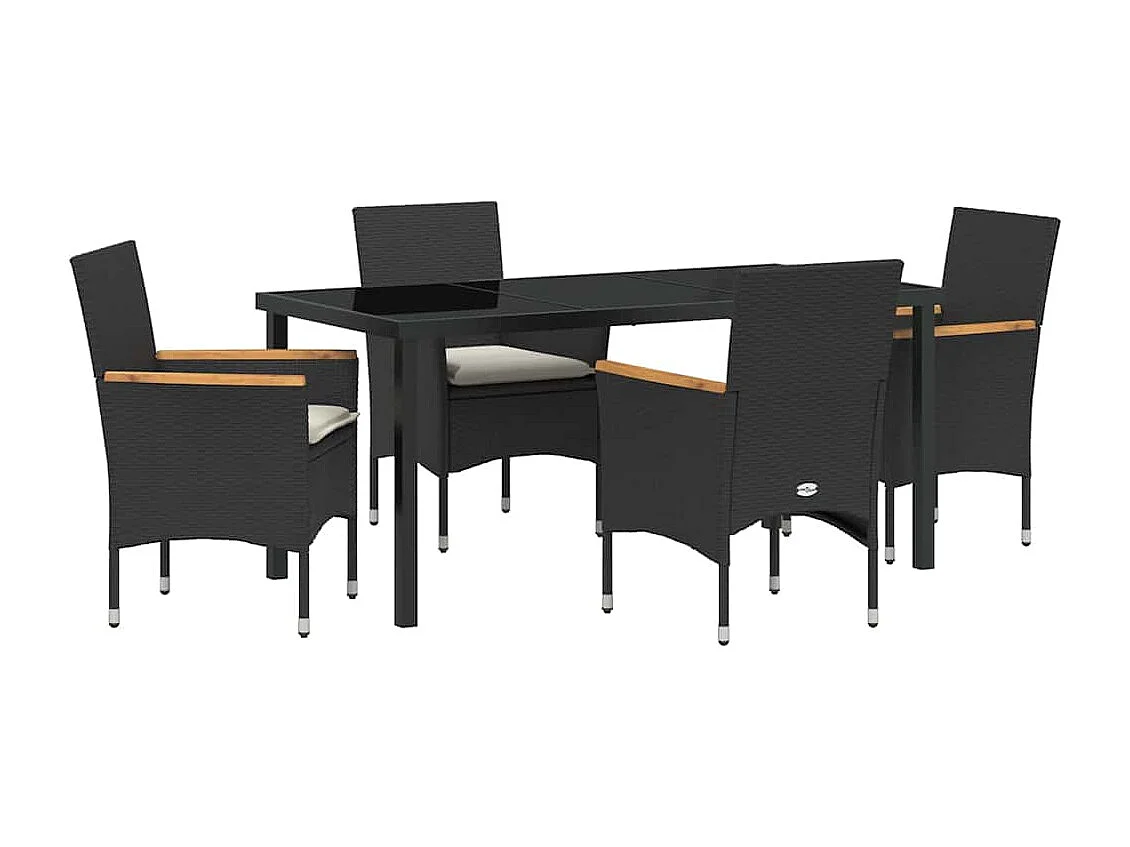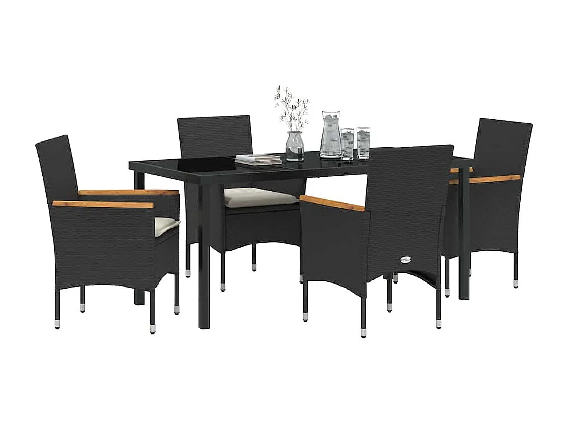5-teiliges Garten-Essset mit schwarzen Polyrattan-Kissen