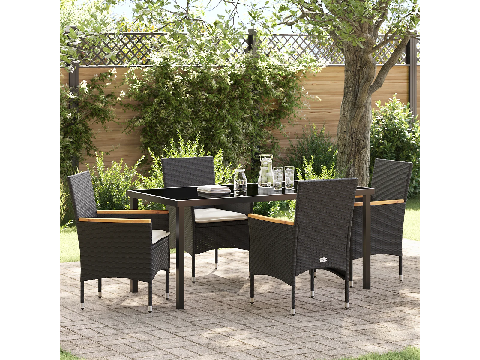 5-teiliges Garten-Essset mit schwarzen Polyresin-Kissen