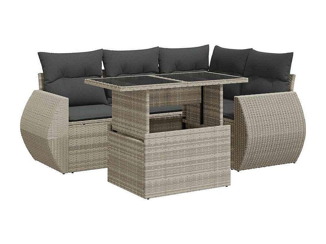 5-teiliges Gartenmöbelset mit hellgrauen Kissen aus gewebtem Harz