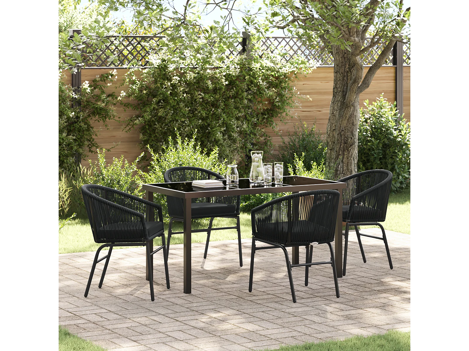 5-teiliges Garten-Essset mit schwarzen Polyresin-Kissen