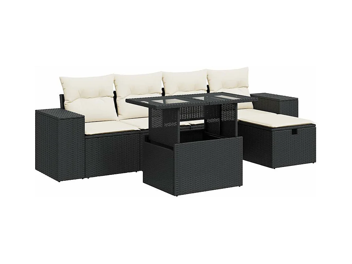 6-teiliges Gartenmöbelset mit schwarzen Kissen aus gewebtem Harz