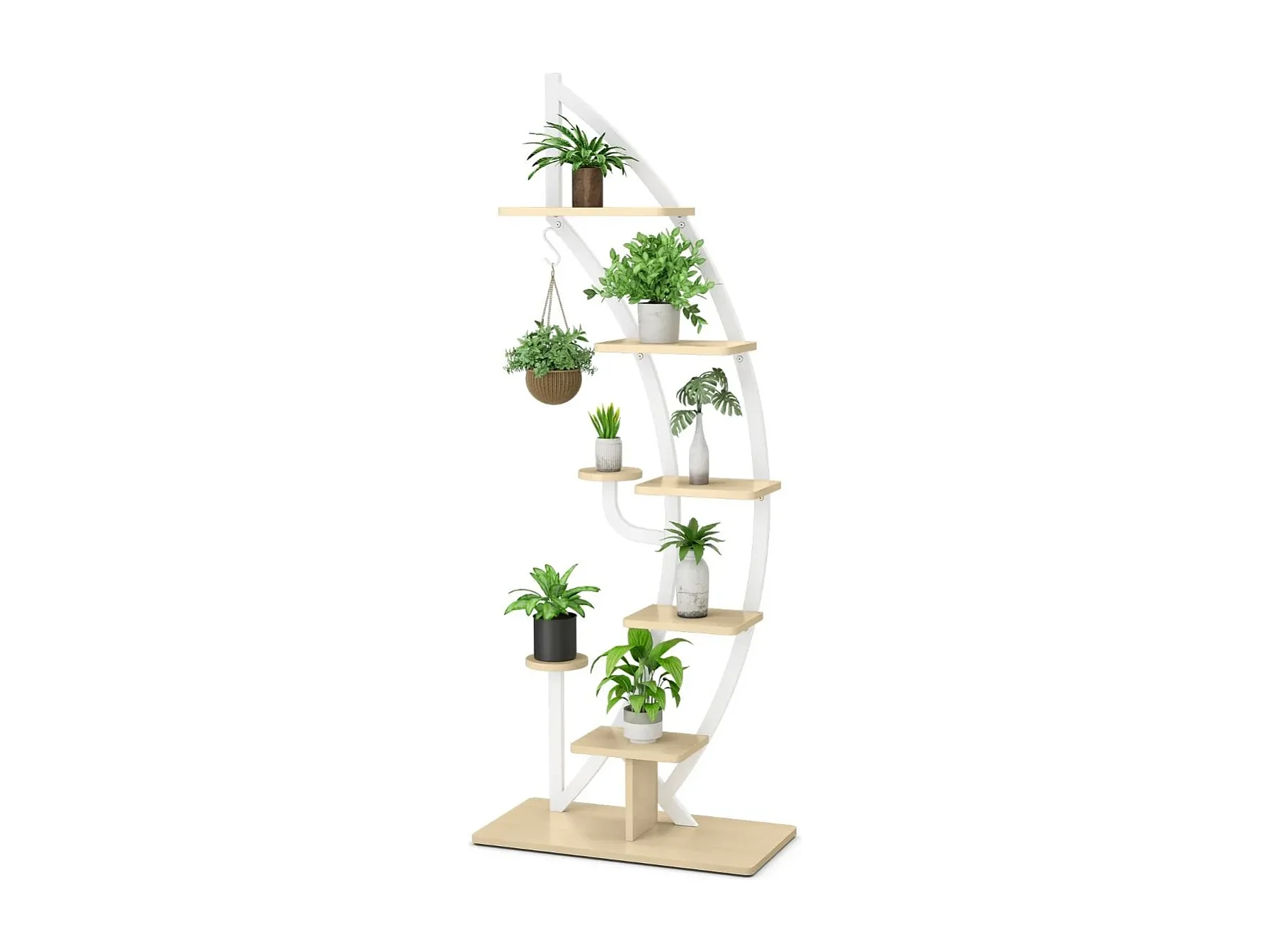 7-stufiger Metall-Pflanzenständer in Halbmondform mit 2 kleine Ablagen & Haken Weiß