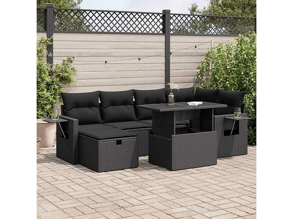 7-teiliges Gartenmöbelset mit schwarzen Kissen aus gewebtem Harz