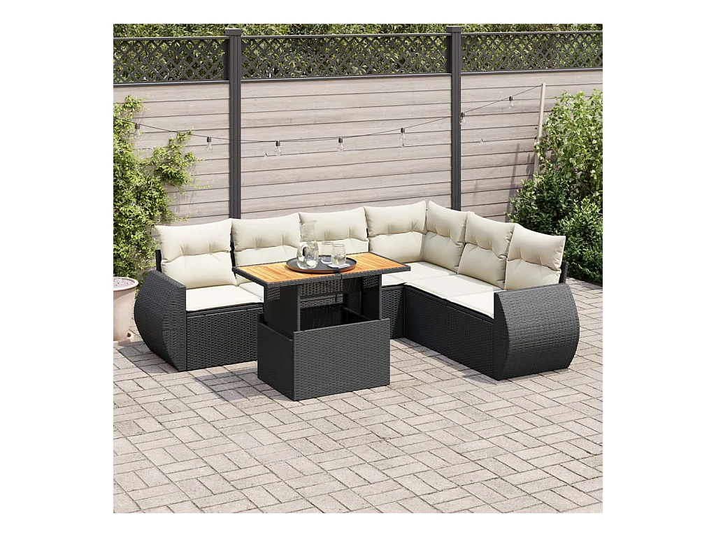 7-teiliges Gartenmöbelset mit schwarzen Kissen aus gewebtem Harz