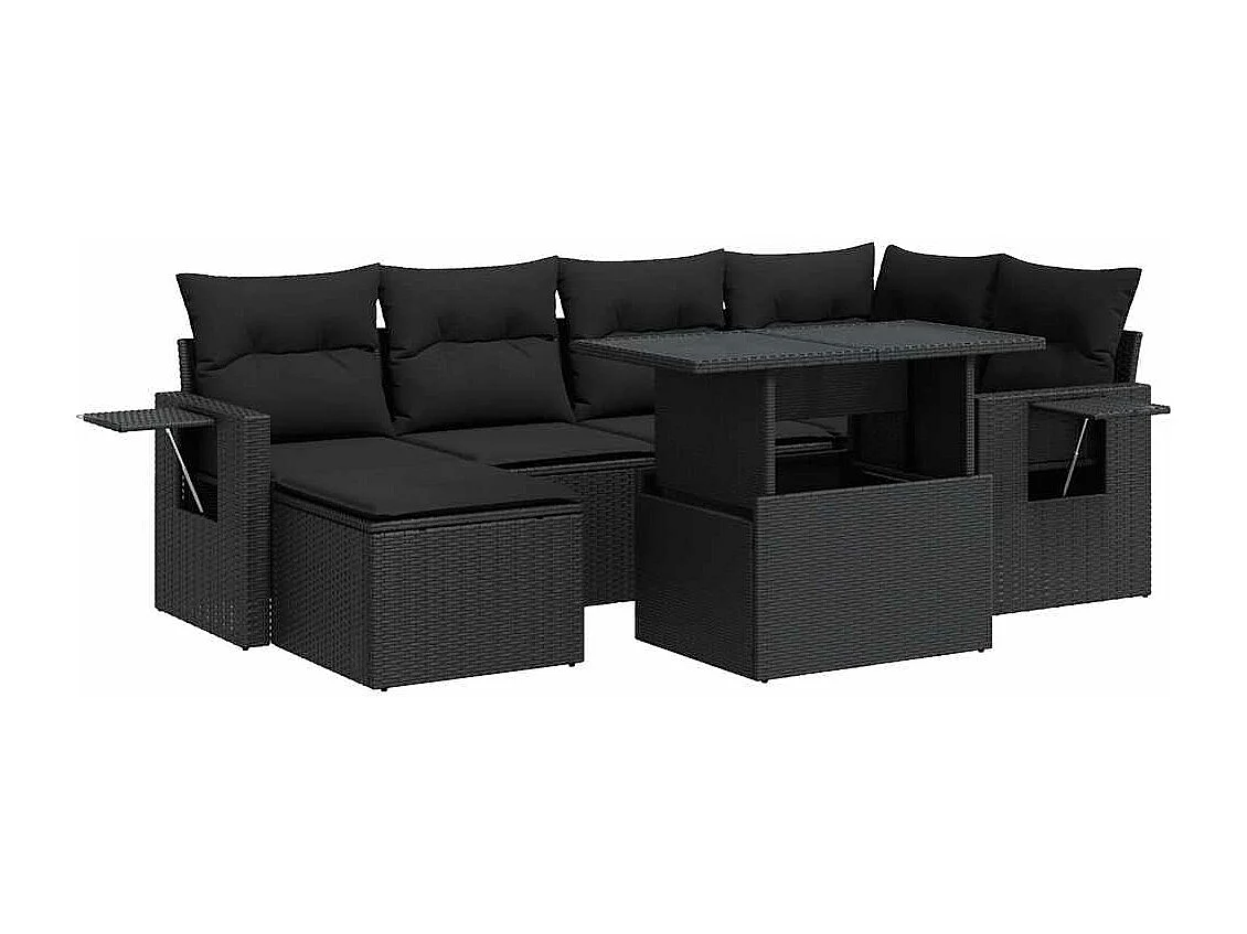 7-teiliges Gartenmöbelset mit schwarzen Kissen aus gewebtem Harz