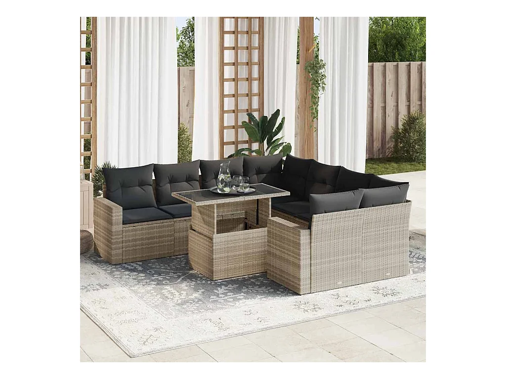 9-teiliges Gartenmöbelset mit hellgrauen Kissen aus gewebtem Harz