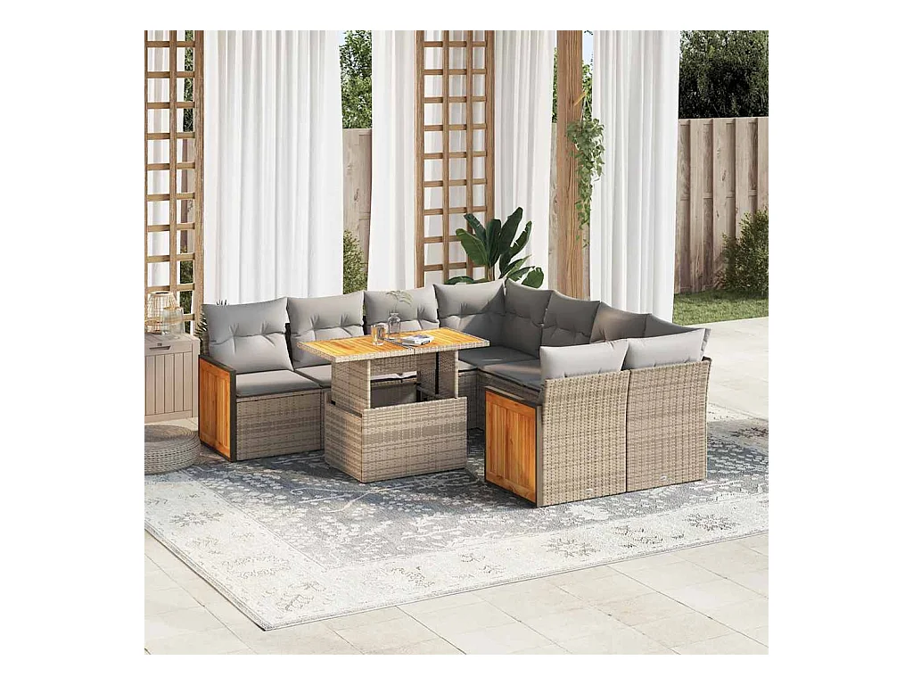 9-tlg. Garten-Sofagarnitur mit Kissen Beige Poly Rattan Akazie