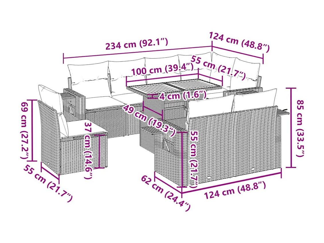 9-tlg. Garten-Sofagarnitur mit Kissen Schwarz Poly Rattan