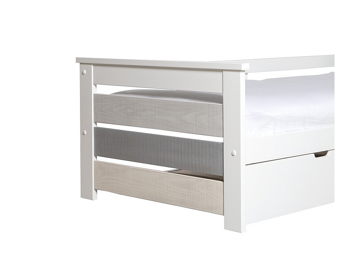 Mit seinen geraden Linien, seinen durchbrochenen Lamellen und den Schattierungen in Weiß, Grau und Beige hat dieses Ausziehbett einen bezaubernden Küstenstil. Dieses praktische Bett kann dank seiner Rückenlehne als Sitzbank genutzt werden und verbirgt eine zweite Liegefläche, die sich sehr leicht ausklappen lässt, um alle Freunde unterzubringen!