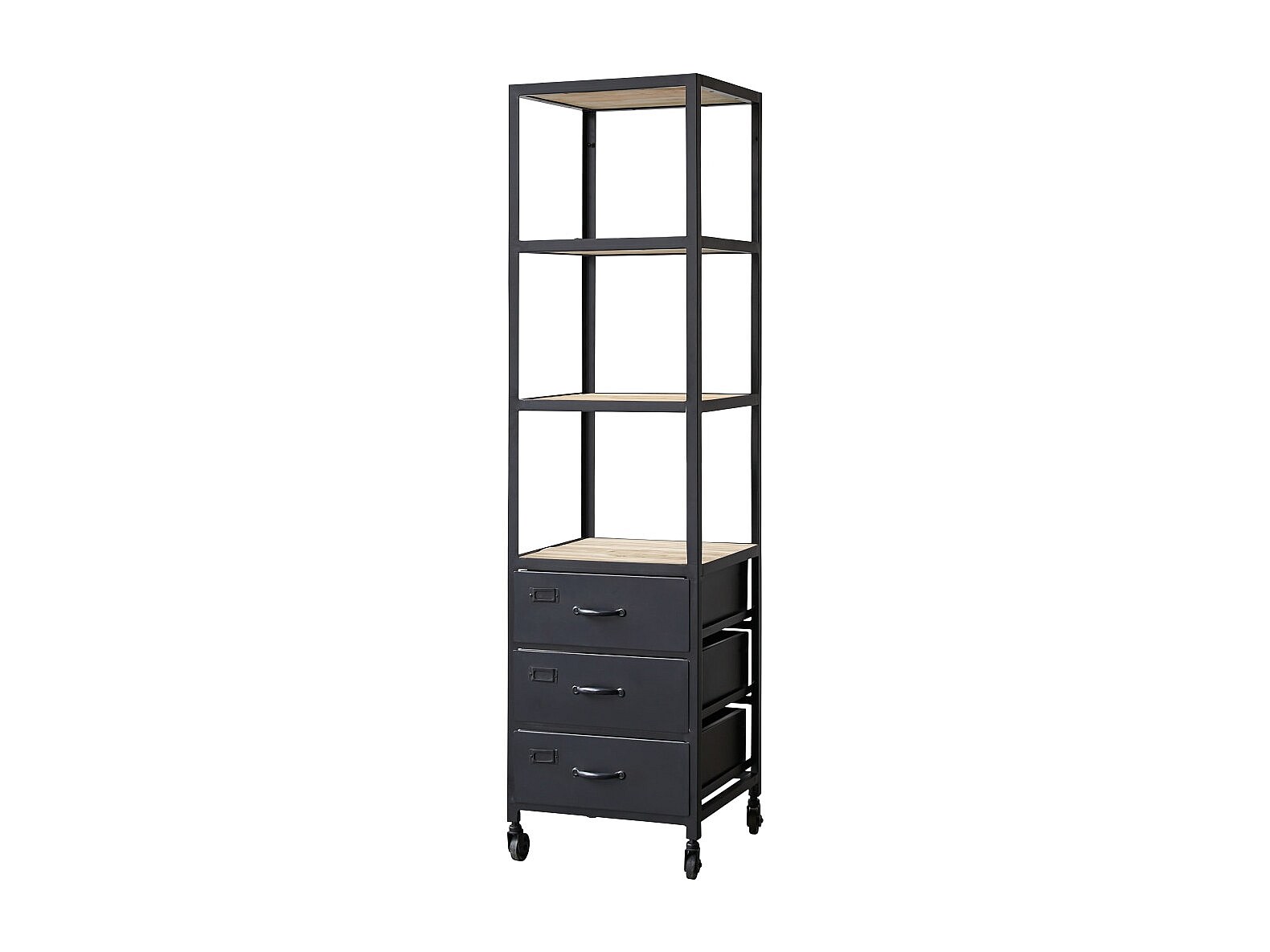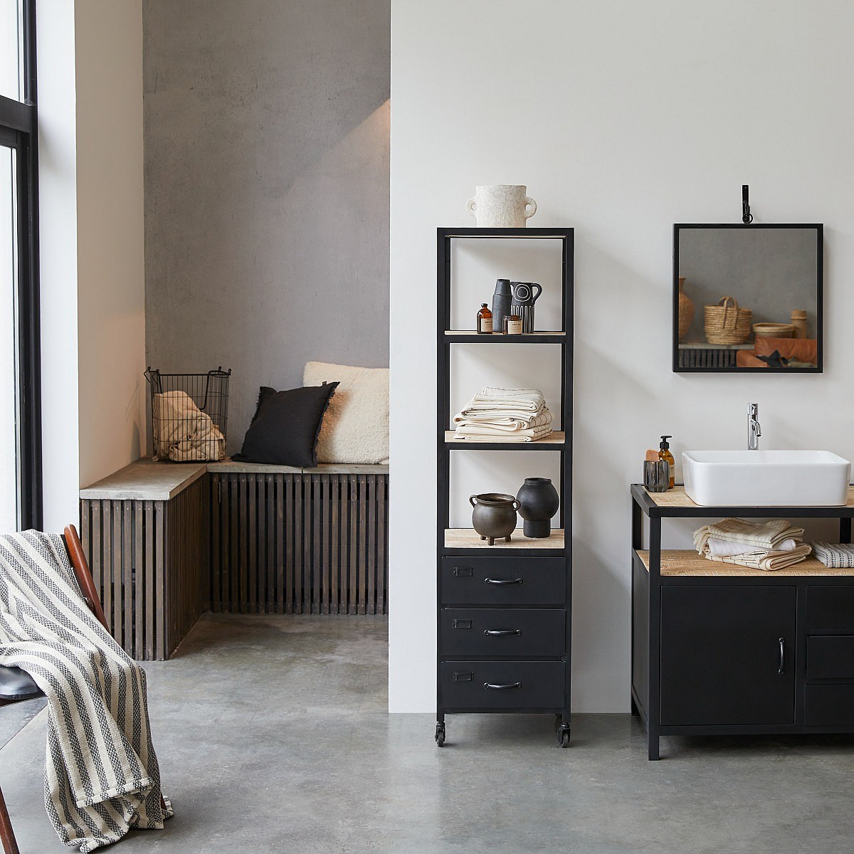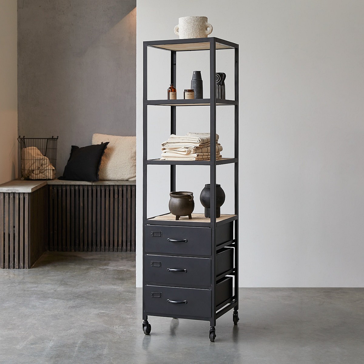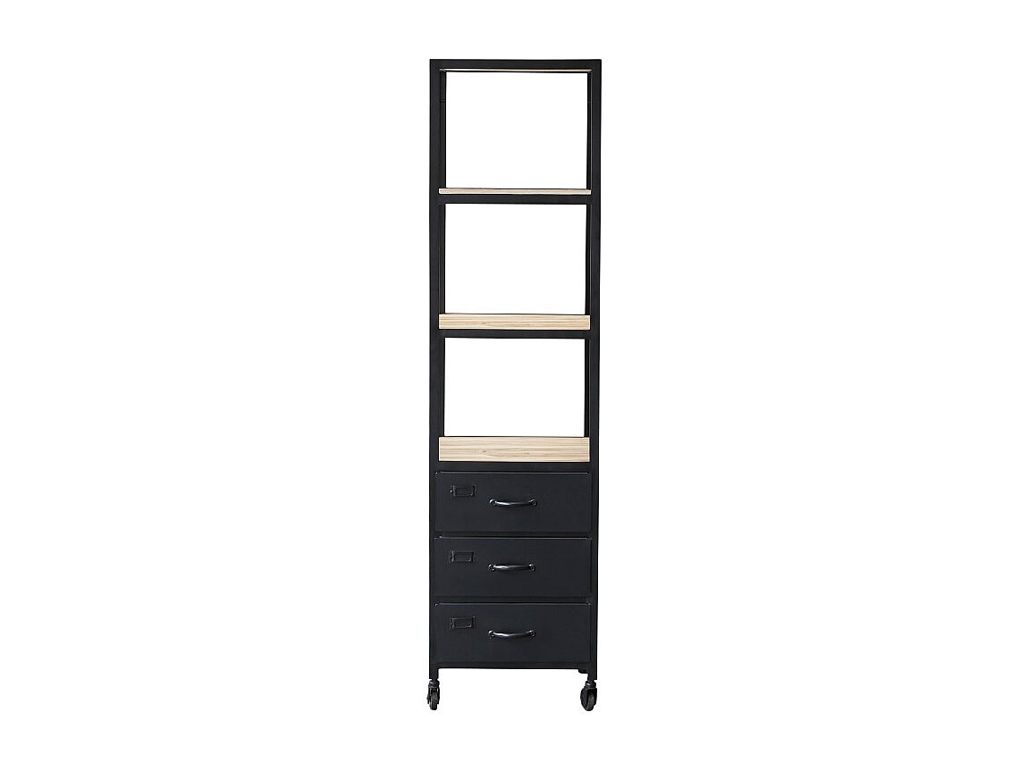 Bad Hochschrank auf Rollen im industriellen Stil Mangoholz und Metall 170 cm