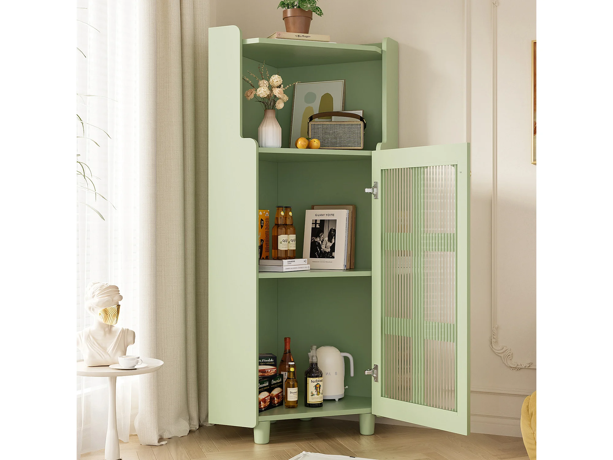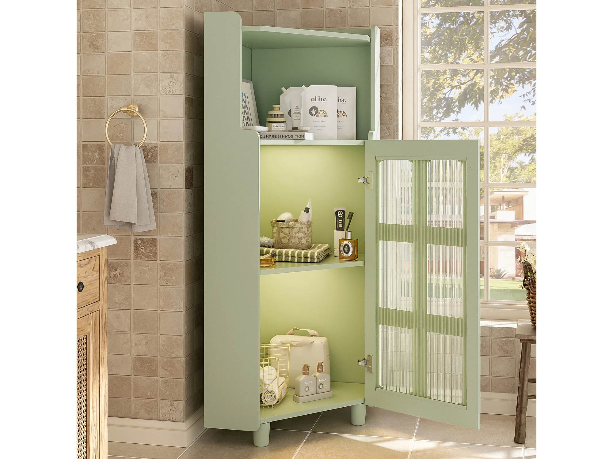 Badezimmer-Ecksäule - mit LED-Beleuchtung - mit 1 Tür - mit 2 Regalböden - mit offenen Regalen - grün
