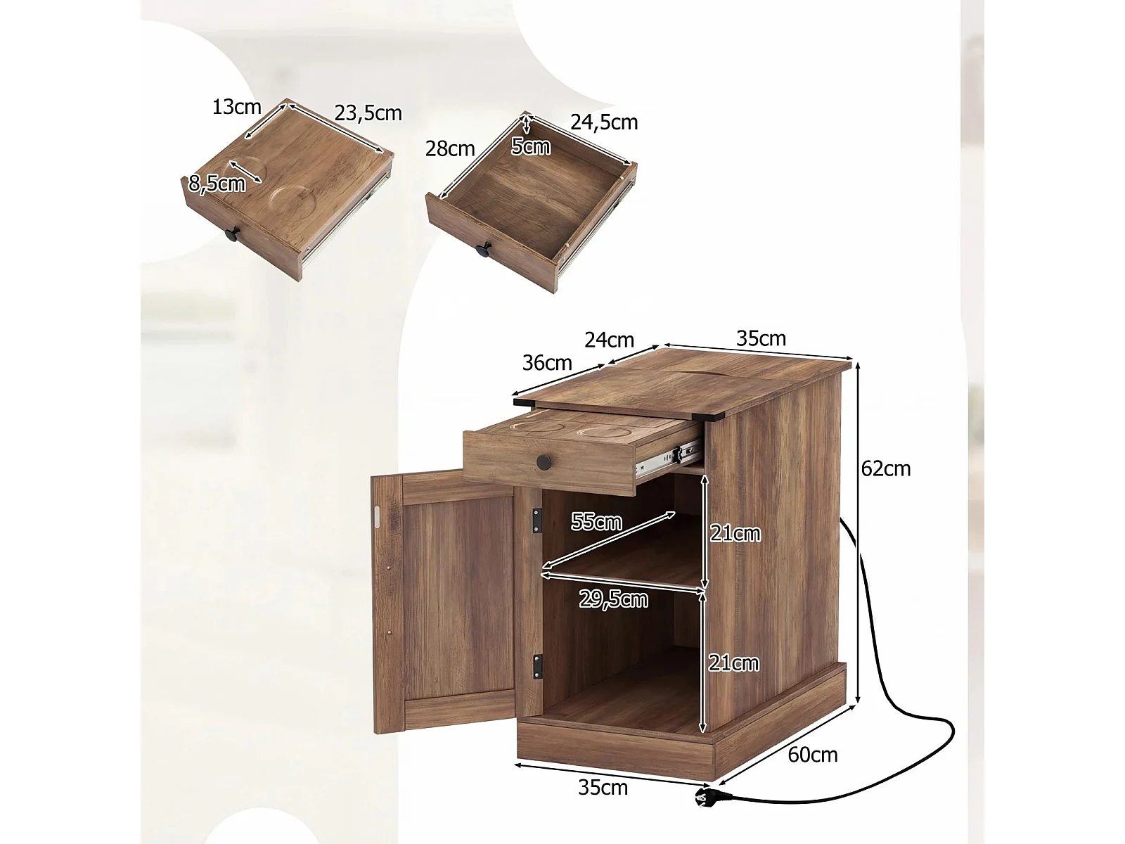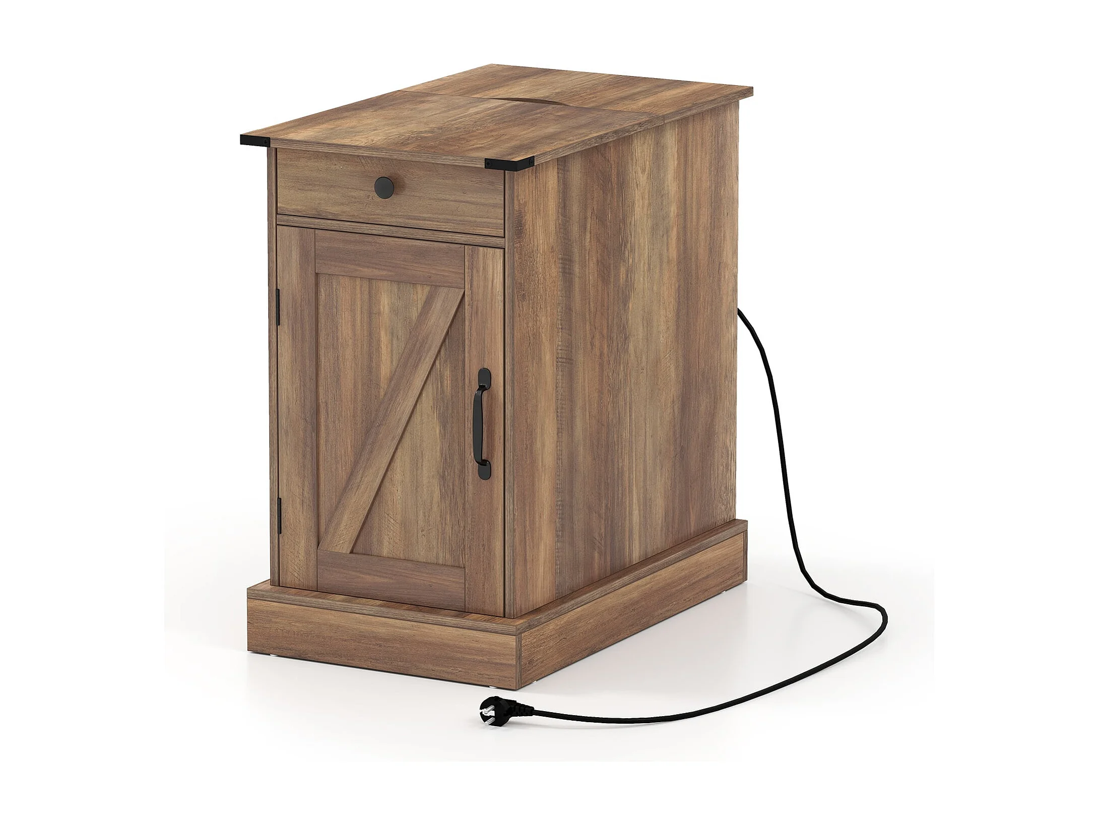Beistelltisch Beistellschrank mit Ladestation Nachttisch mit klappbarer Tischplatte Schublade Rustikales Braun