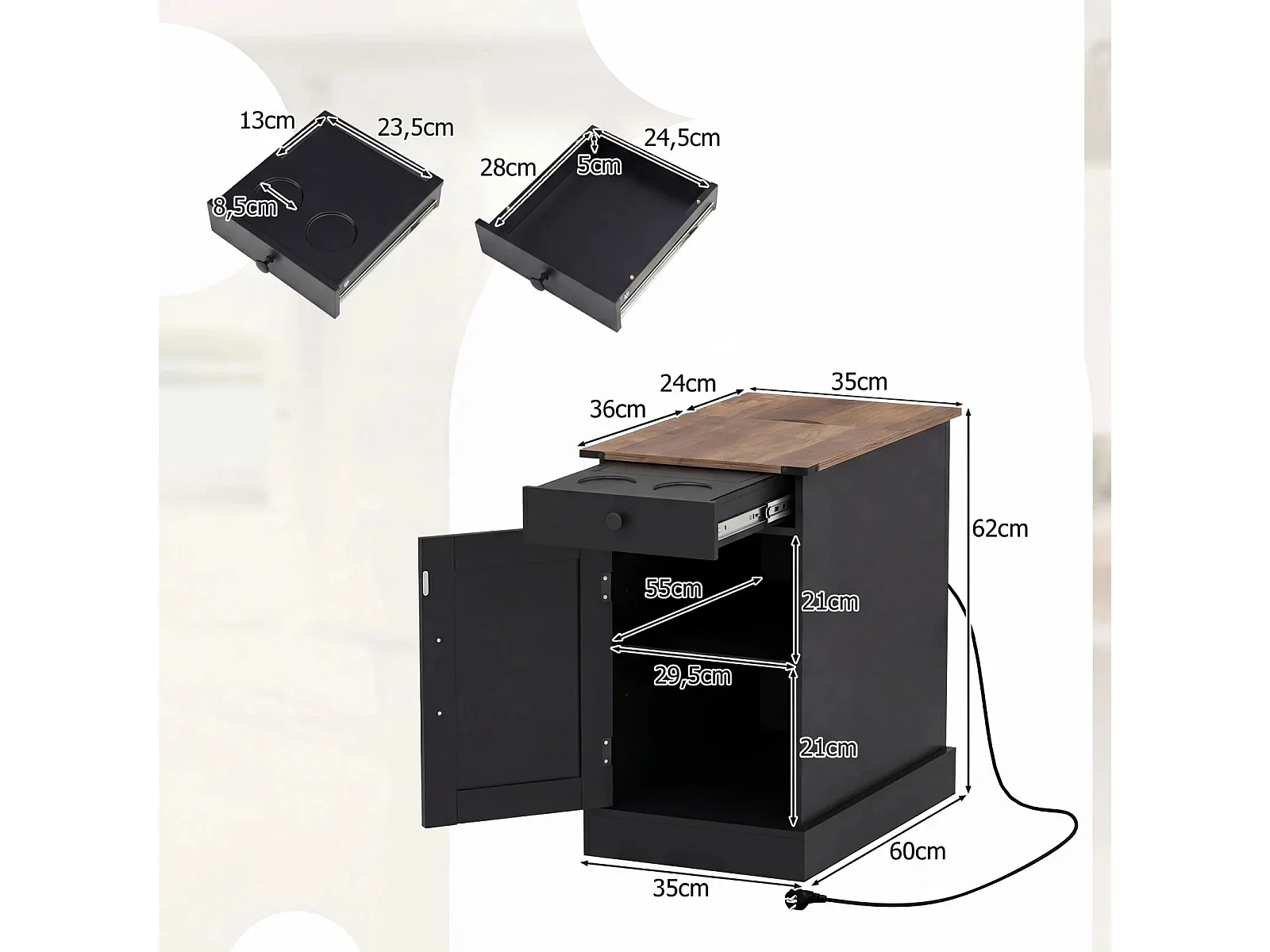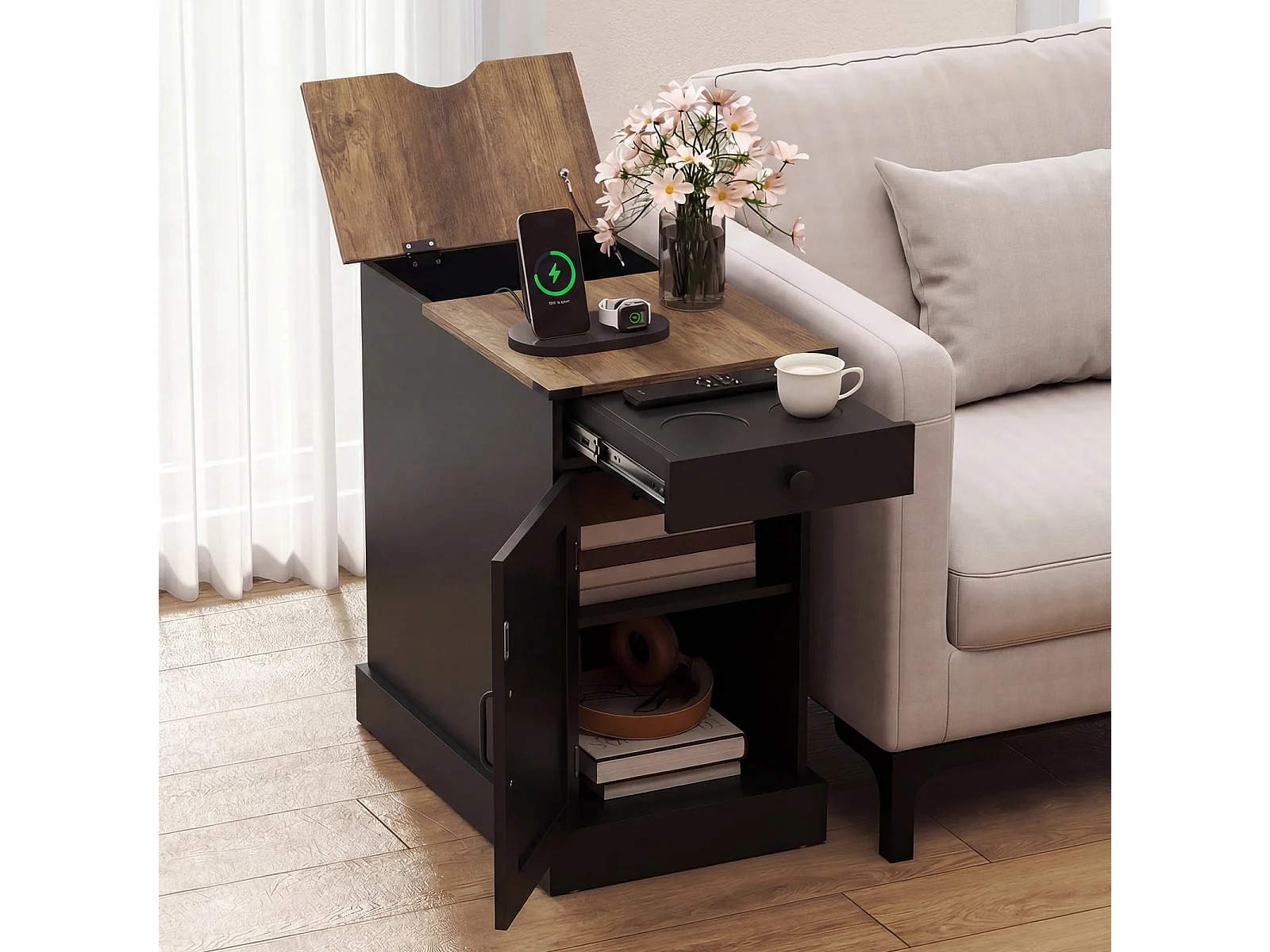 Beistelltisch Beistellschrank mit Ladestation Nachttisch mit klappbarer Tischplatte Schublade Schwarz