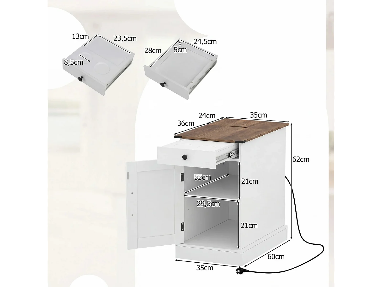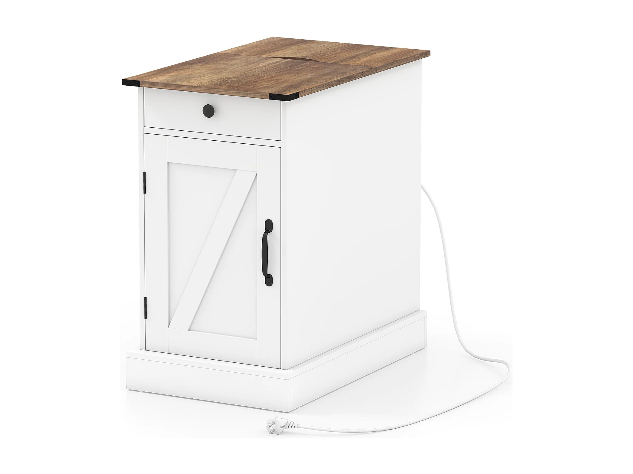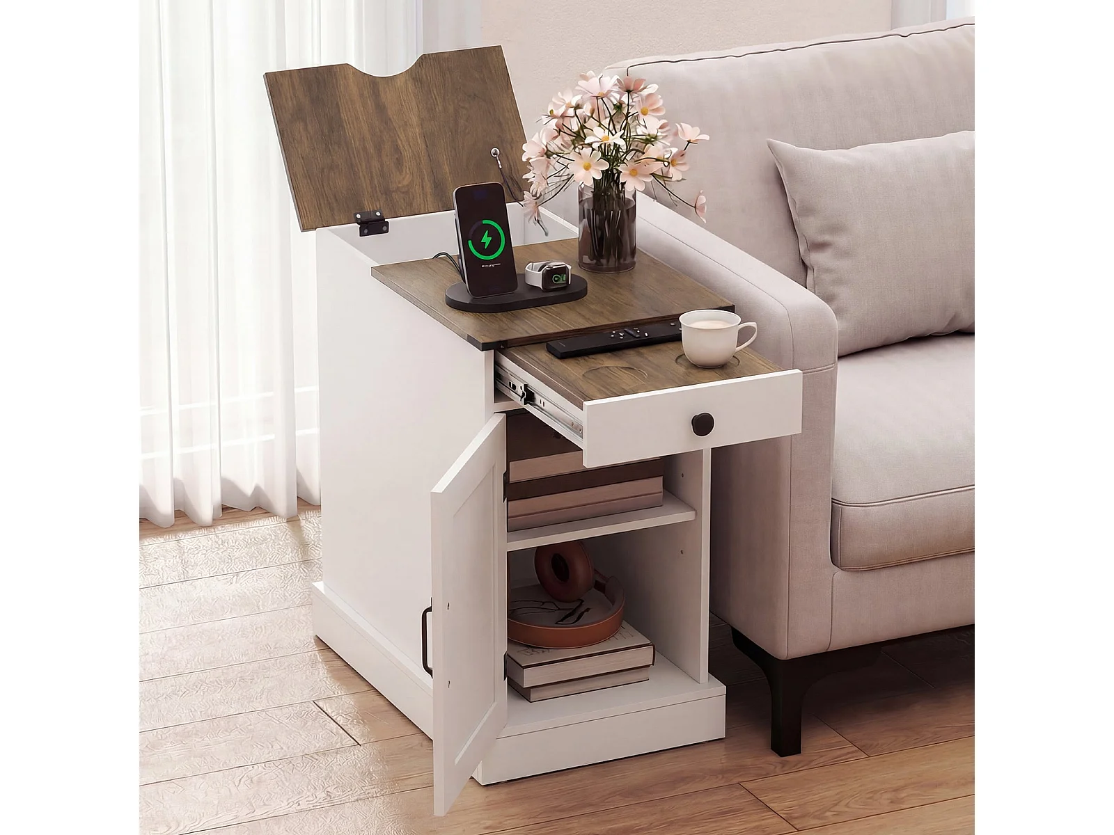 Beistelltisch Beistellschrank mit Ladestation Nachttisch mit klappbarer Tischplatte Schublade Weiß