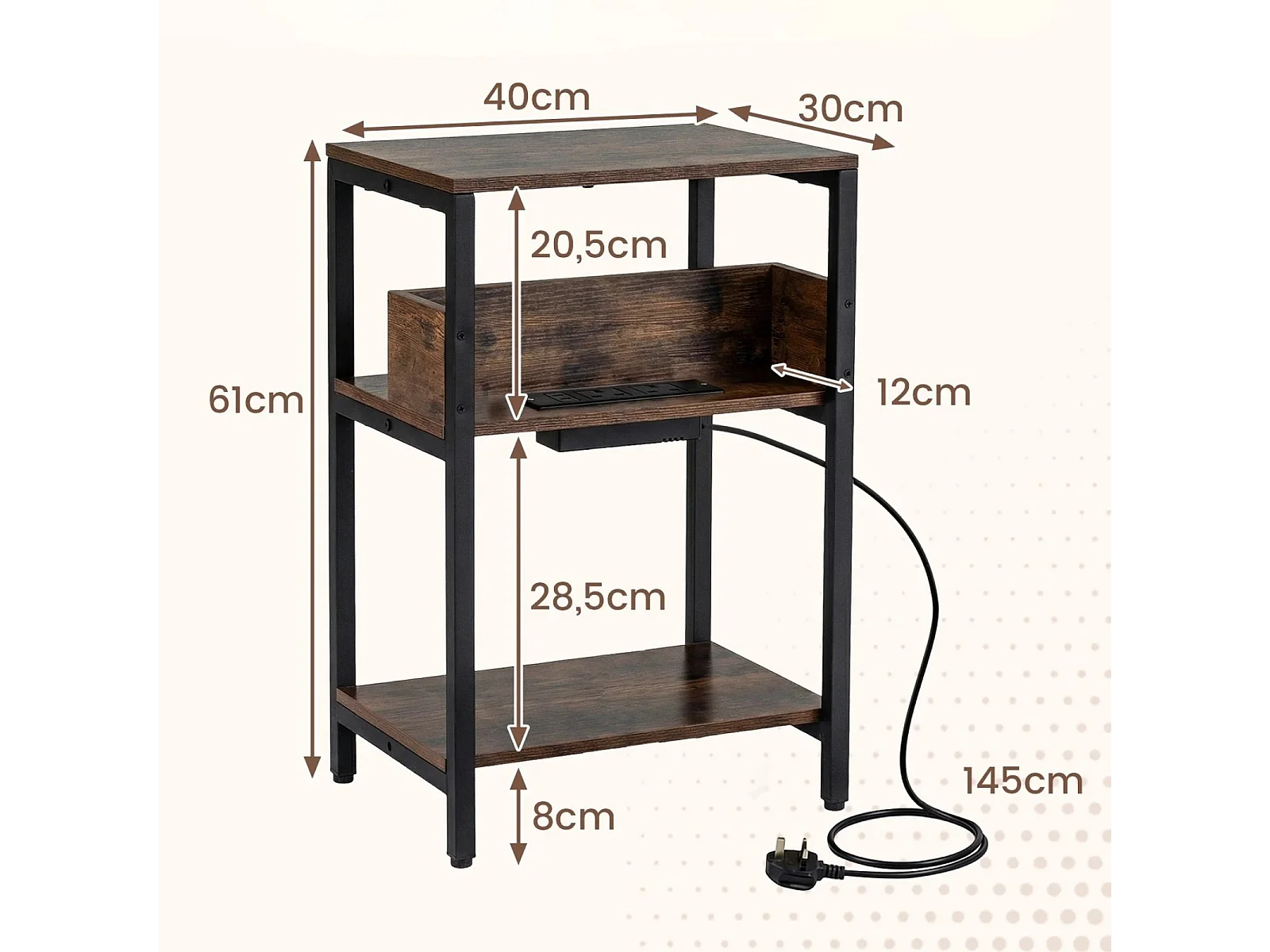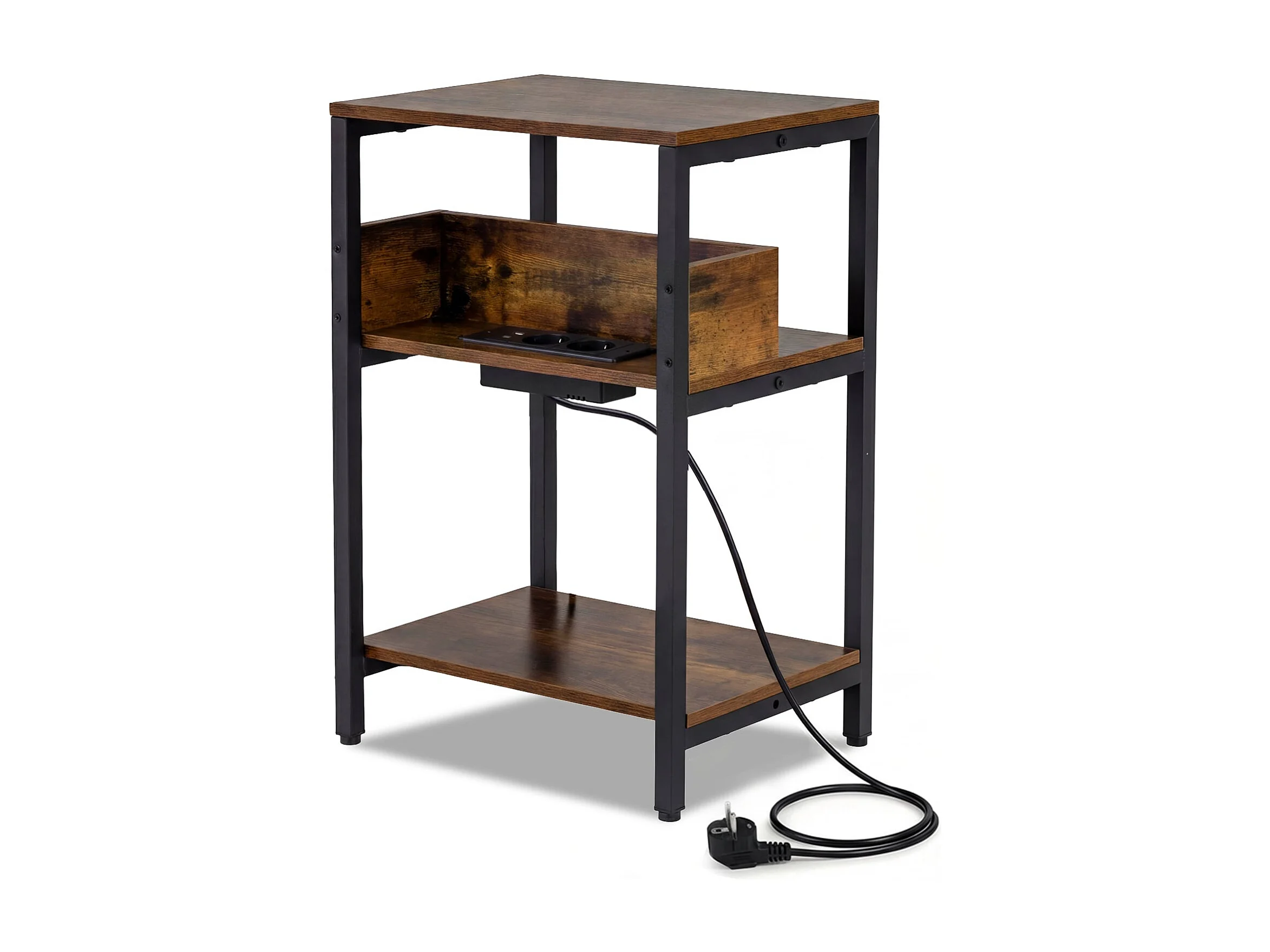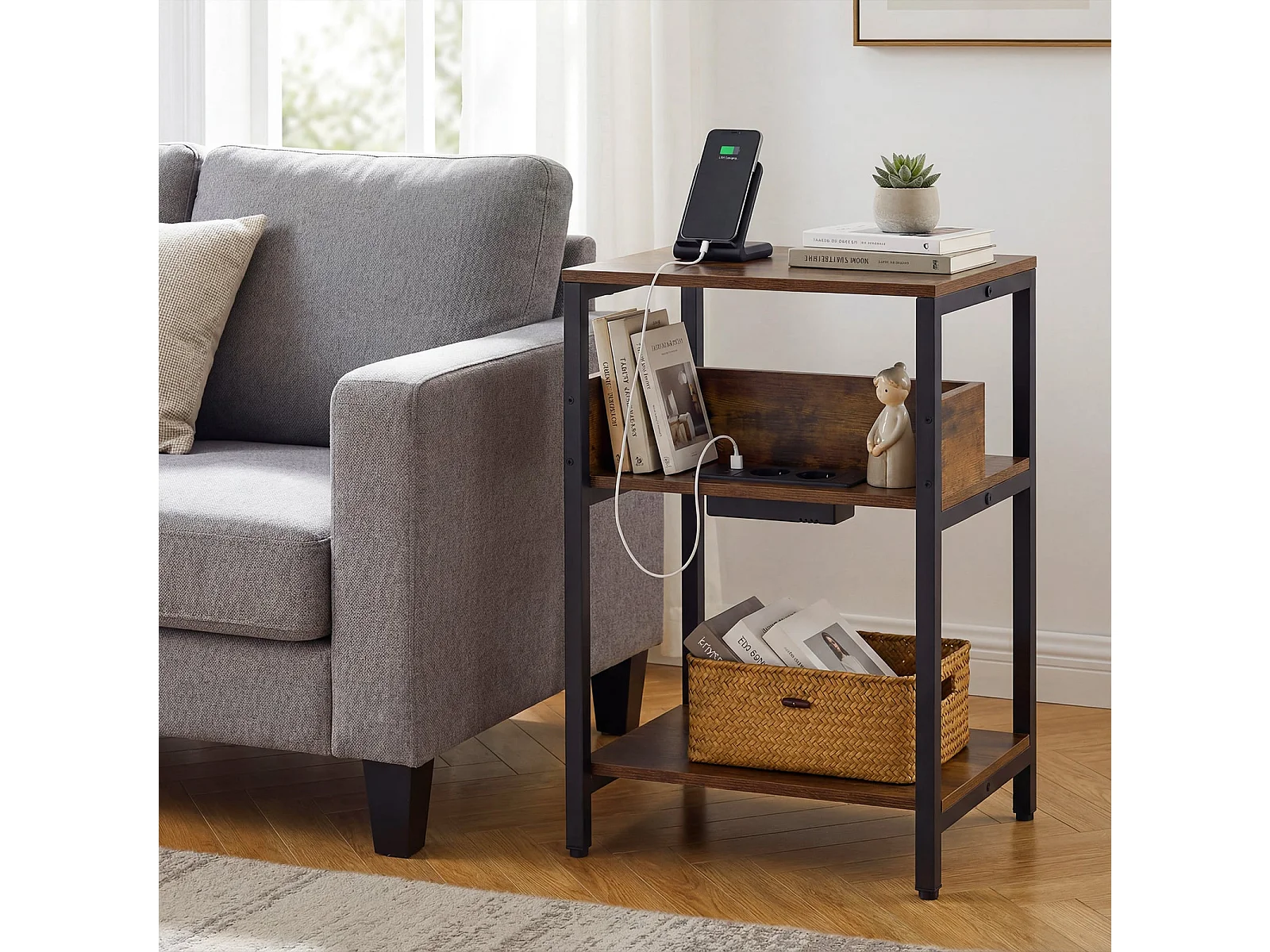Beistelltisch mit Ladestation 3-stufiger Endtisch mit offenen Aufbewahrungsregalen Nachttisch Rustikal Braun