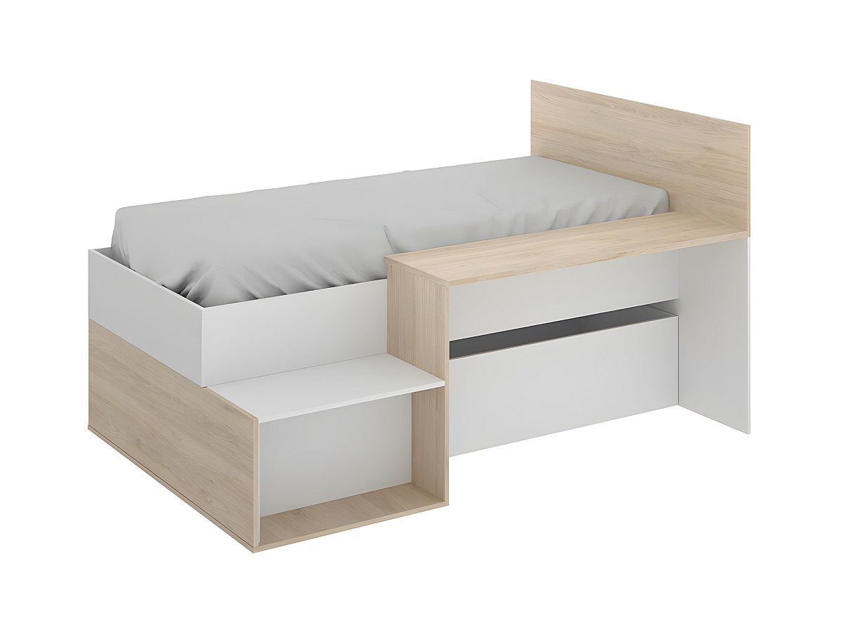Bett mit Stauraum & Schreibtisch LISON - 90 x 190 cm - Weiß & Eichenholzfarben