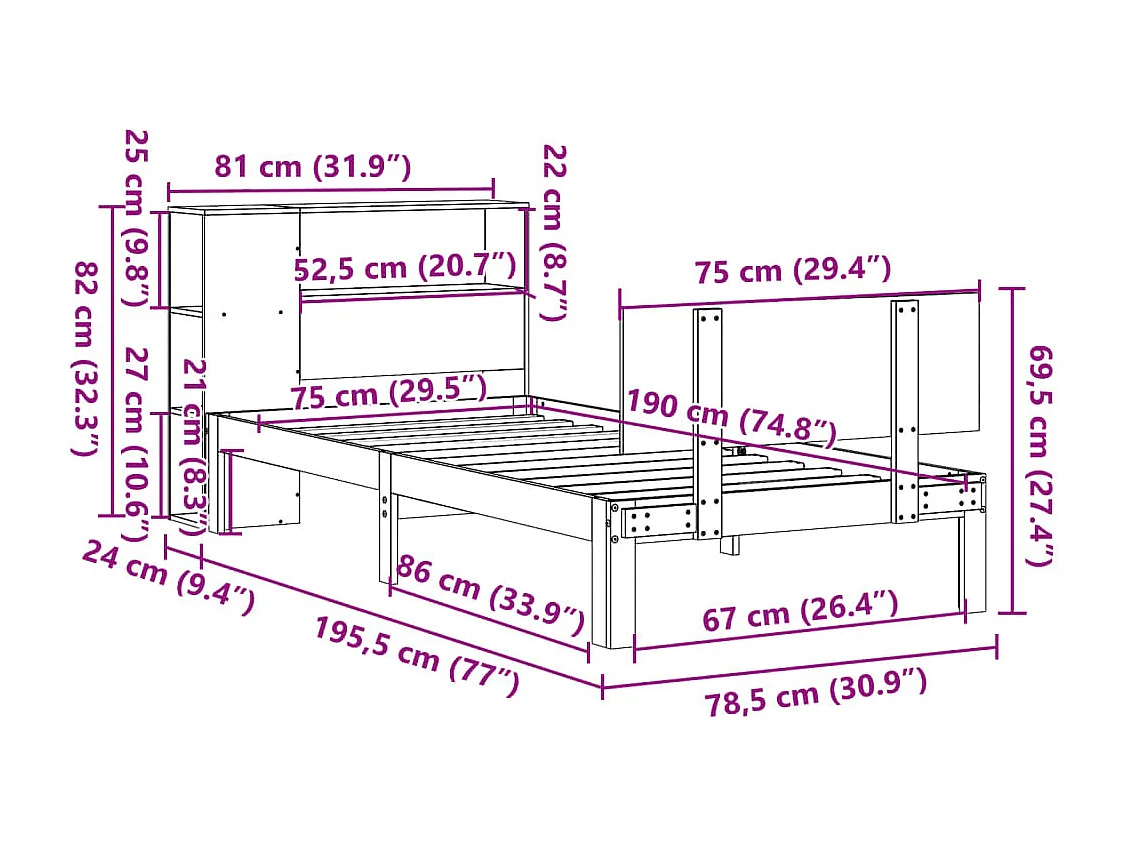 Bücherregalbett ohne Matratze 75x190 cm Massivholz Kiefer