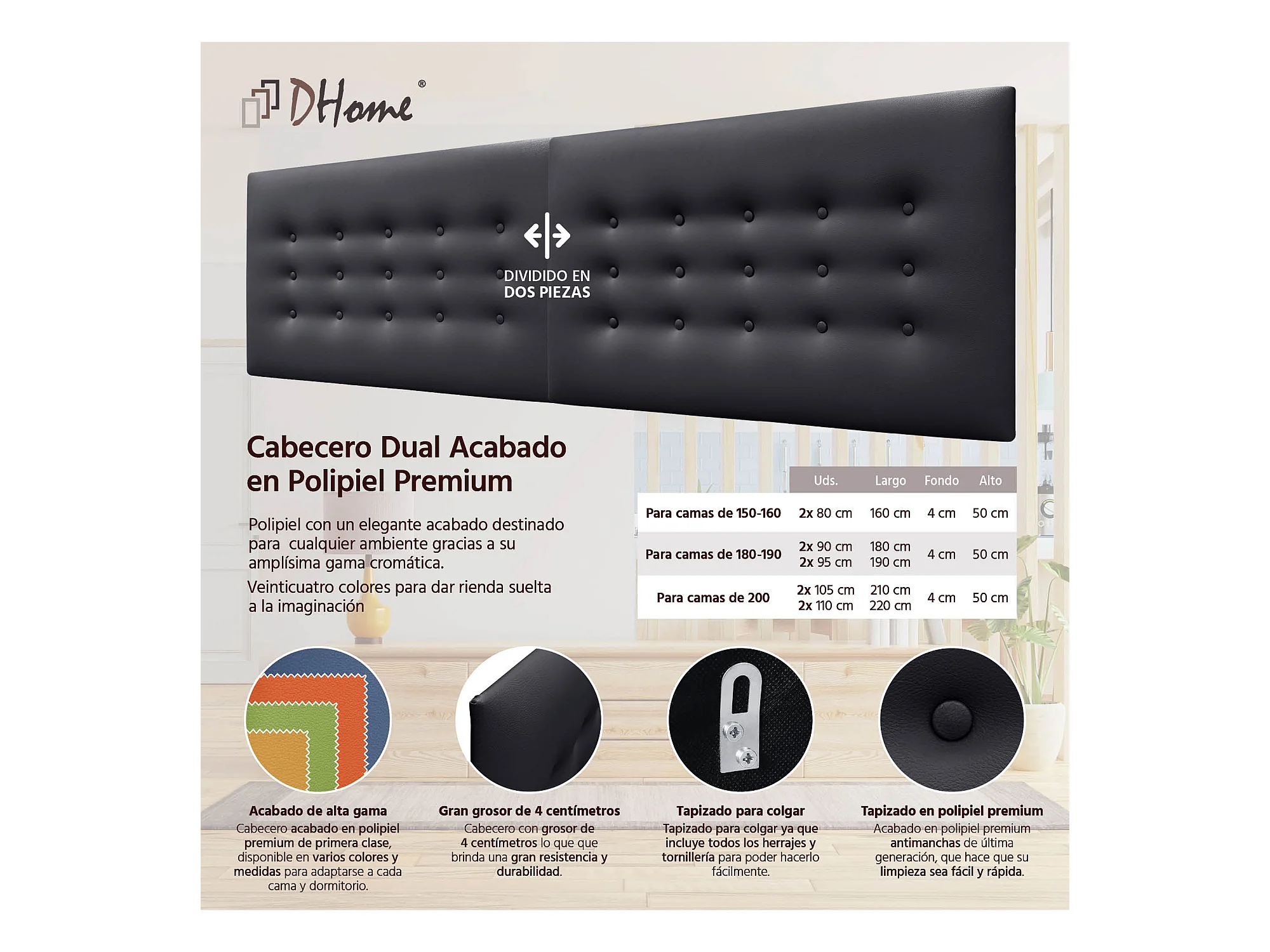 DHOME Kopfteil de Kunstleder mit 3 Knopfreihen gepolstertes luxuriöses Bettkopfteil (Negro, 220cm (2 piezas))