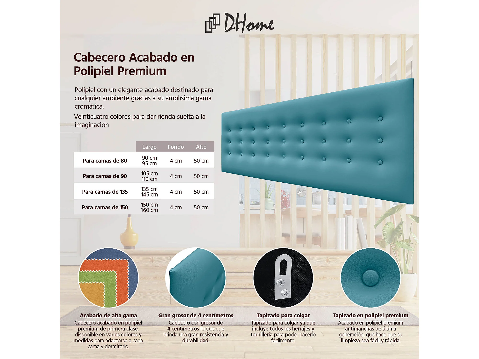 DHOME Kopfteil de Kunstleder mit 3 Knopfreihen gepolstertes luxuriöses Bettkopfteil (Turquesa, 150cm)