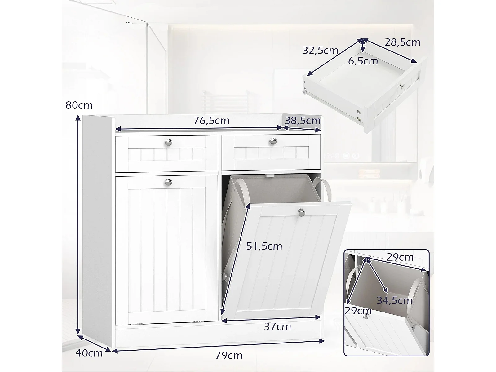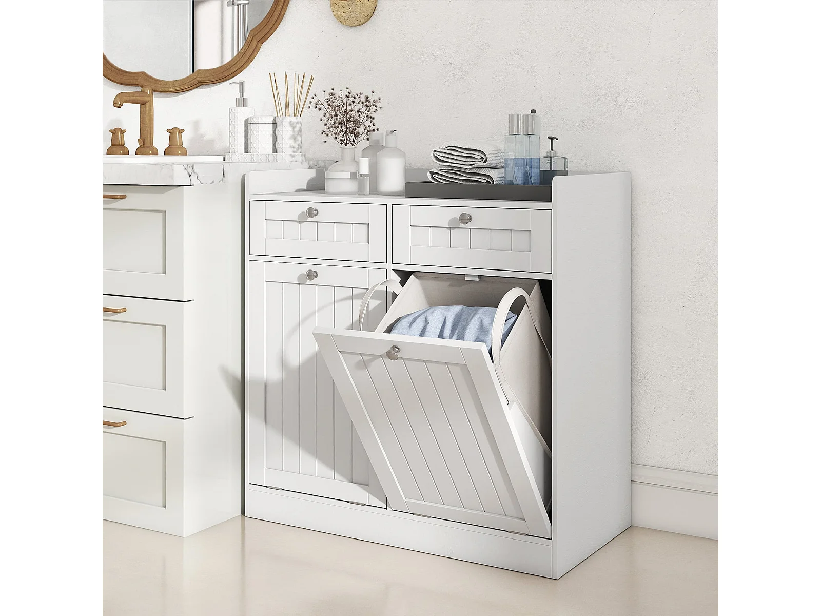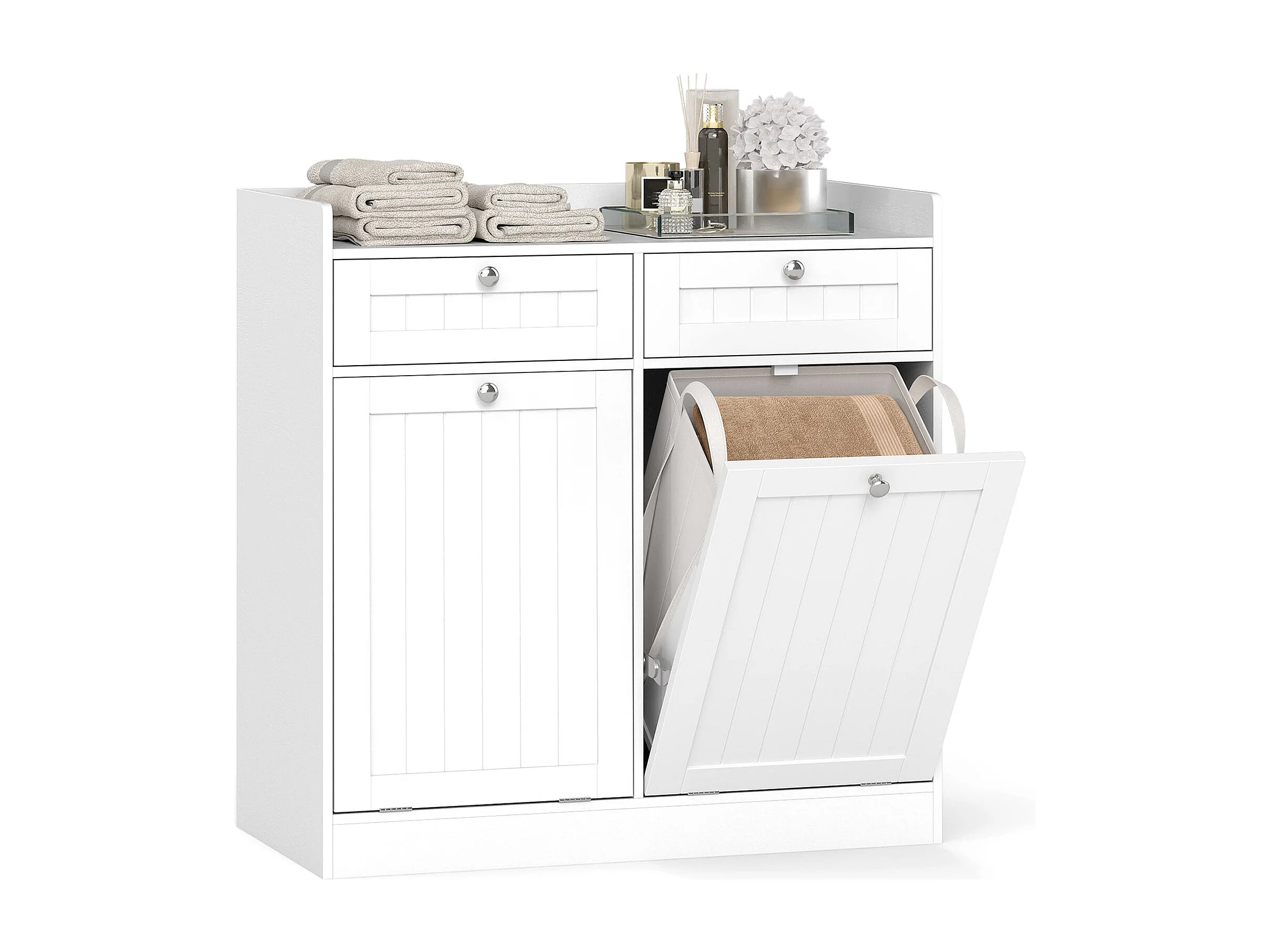 Doppel-kippbarer Wäscheschrank mit Regal & 2 Schubladen & 2 Abnehmbaren Wäschesäcken Weiß