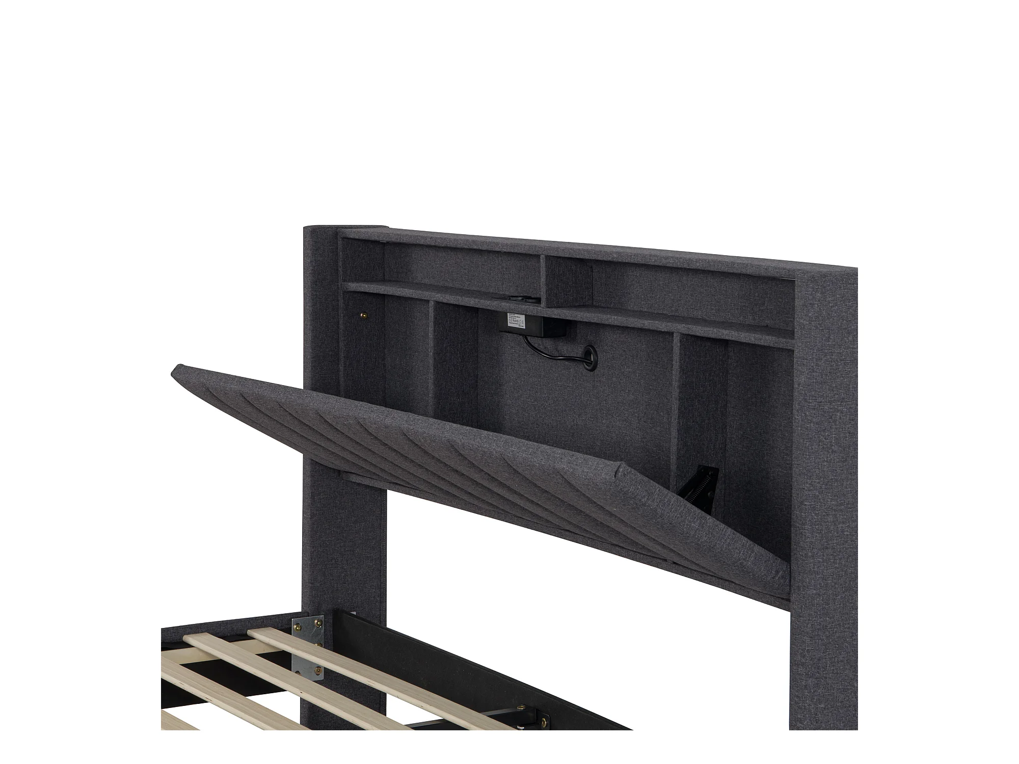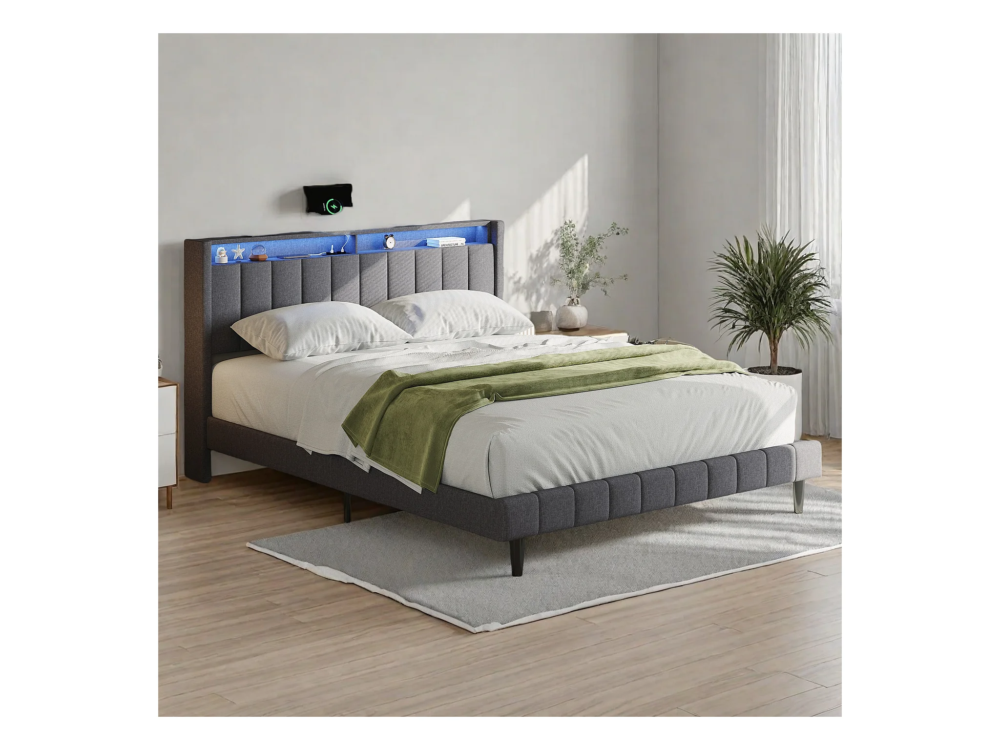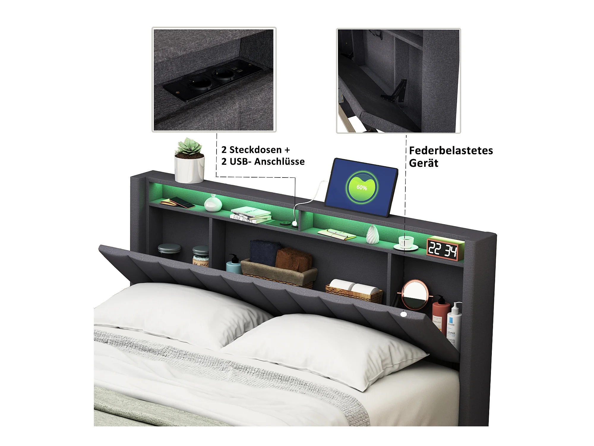 Polsterbett, 140 x 200 cm, mit LED und USB-Aufladung, funktional, Stauraum, grau