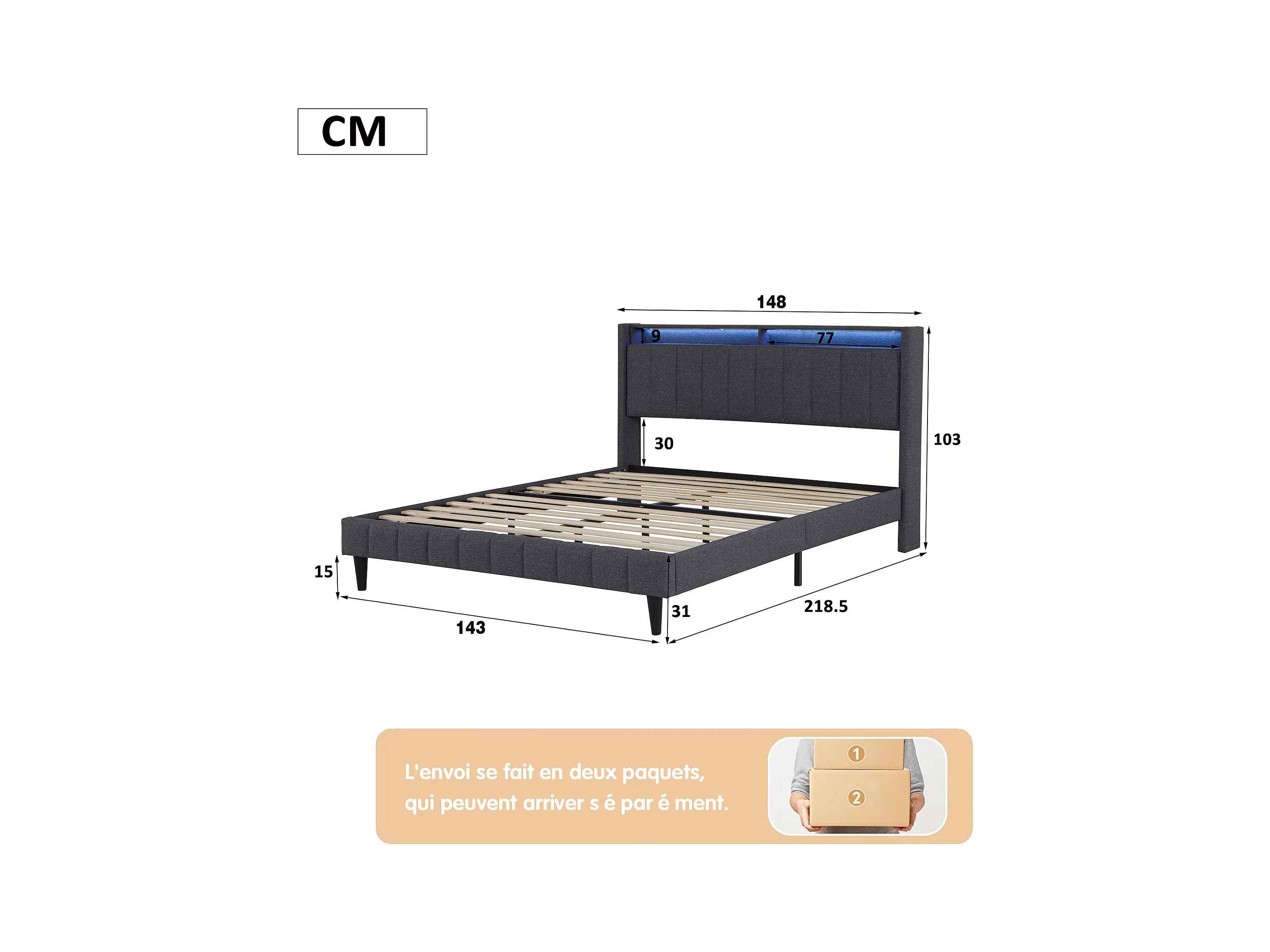 Doppelbett 140x200, mit Stauraum, gepolsterte Leinenbetten mit USB und Typ-C, LED, grau