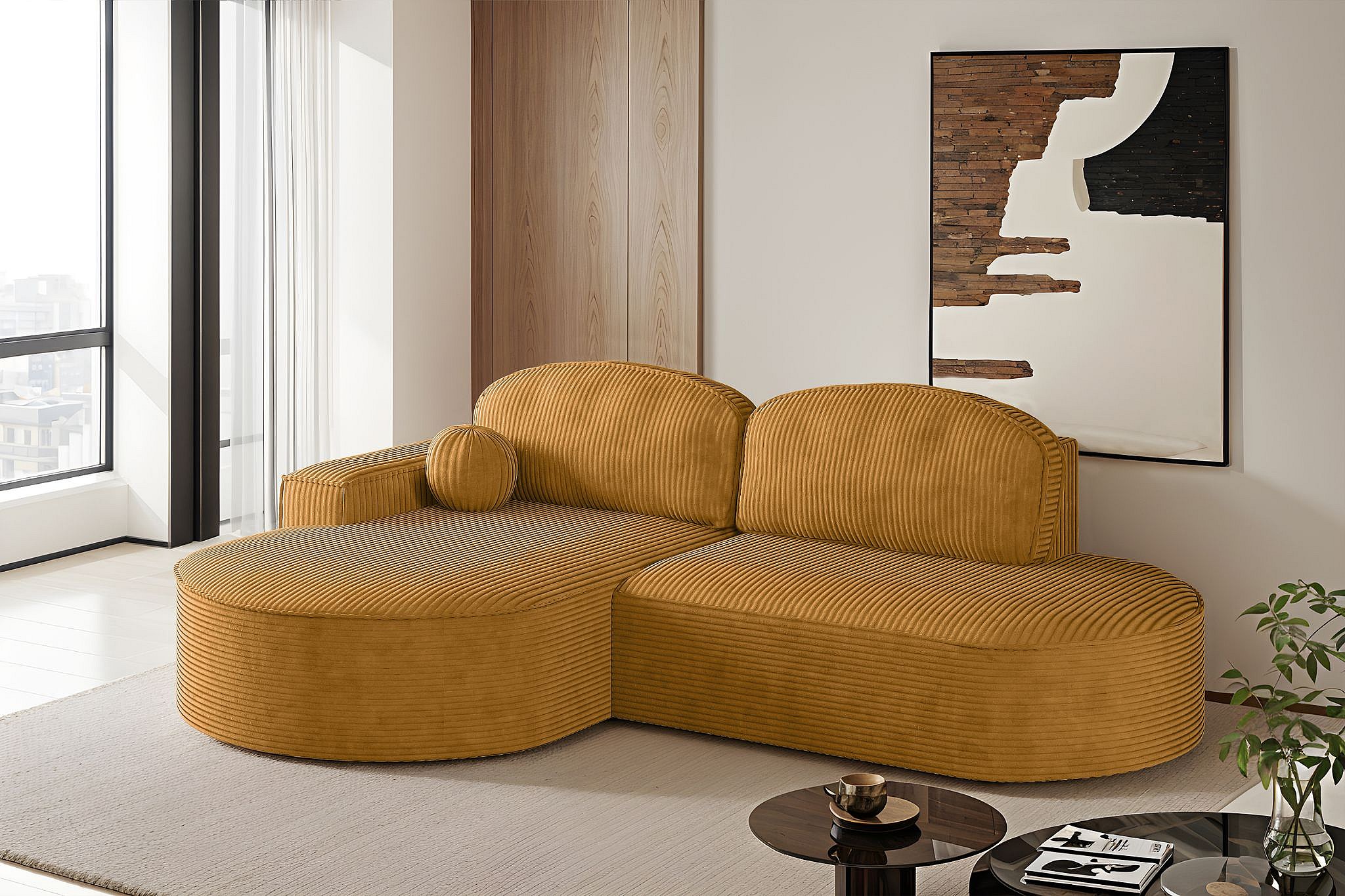 Ecksofa mit Schlaffunktion und Bettkasten Modena Runden stoff Poso Senffarbe Links