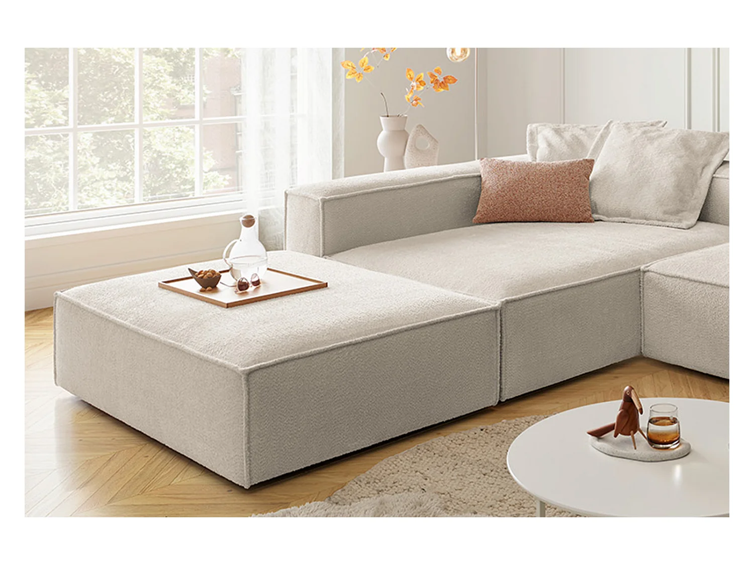 Modul Ecksofa APRICA Bouclé Weiss mit Ottomane 3-Sitzer
