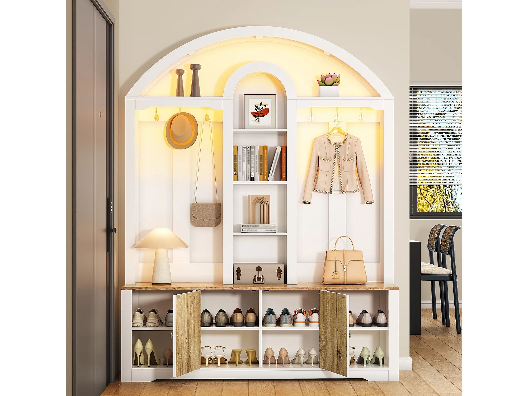 Flurschrank mit Schuhregal, Ablagen, Haken und 2 Türen – 150 x 40 x 195 cm – MDF – weiß