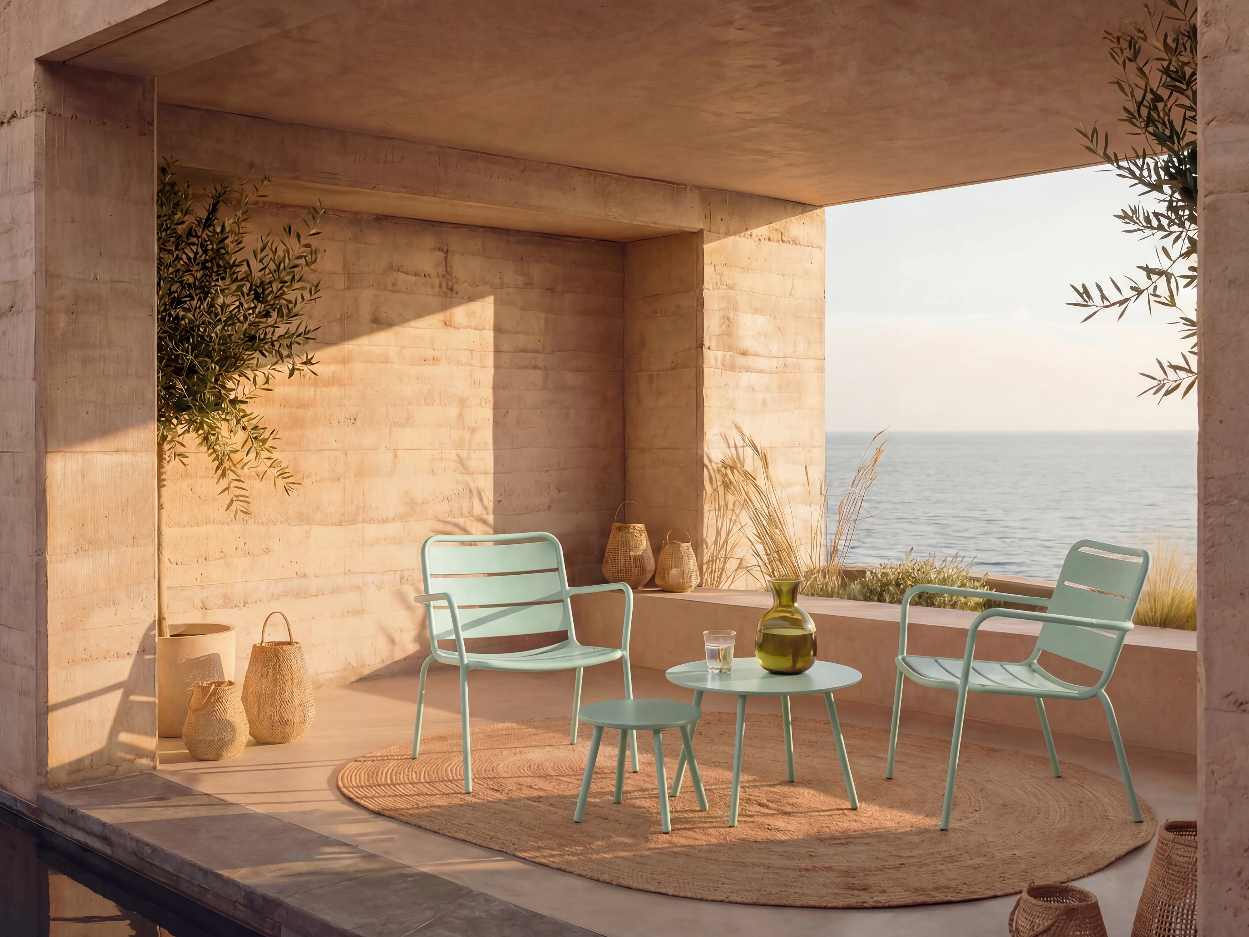 Garten-Sitzgruppe: 2 Beistelltische + 2 stapelbare Sessel - Metall - Hellgrün - MIRMANDE von MYLIA
