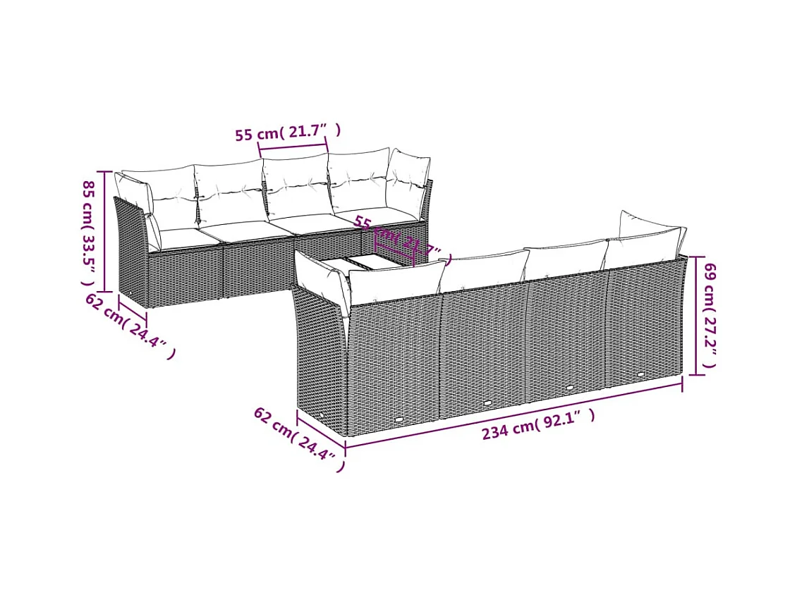 Gartenmöbel-Set mit Kissen 9-tlg. braunes Korbgeflecht