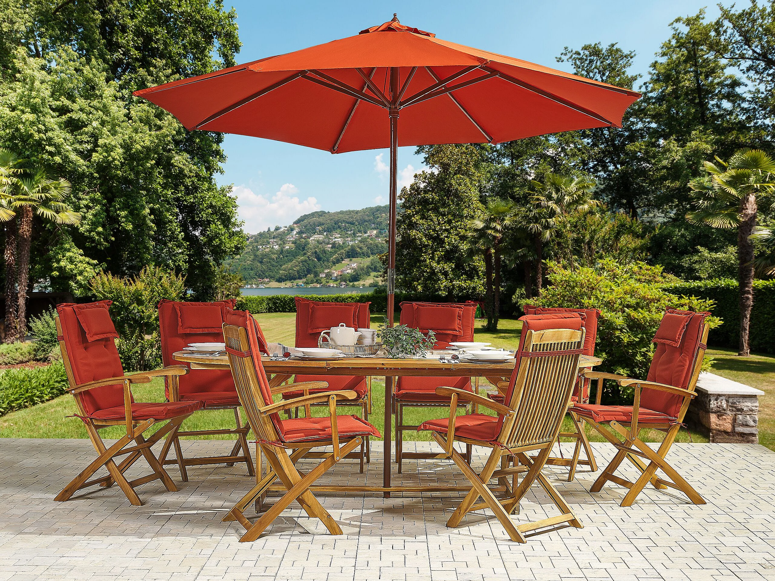 Gartenmöbel Set 8-Sitzer MAUI mit Schirm Akazienholz Dunkelrot