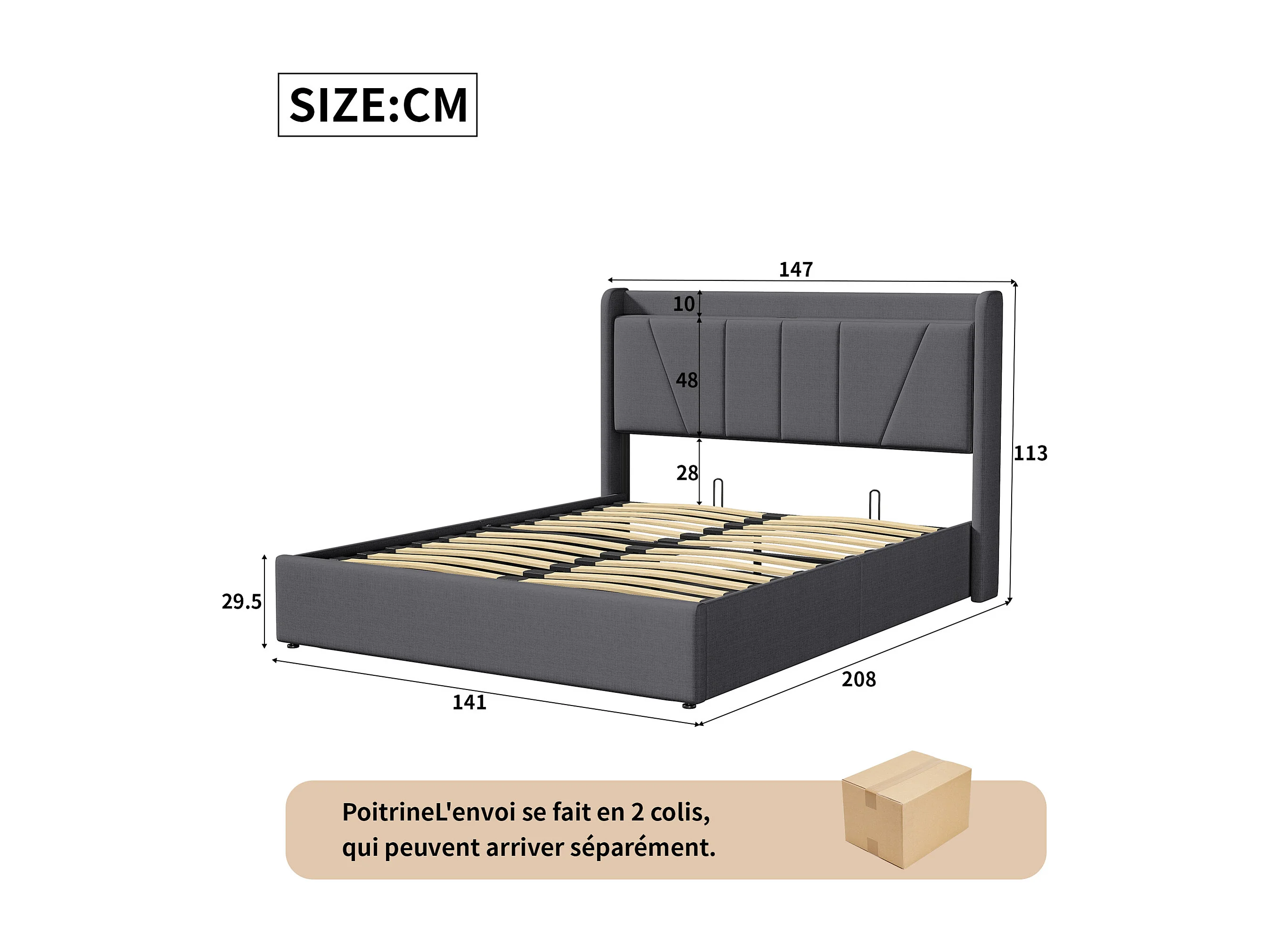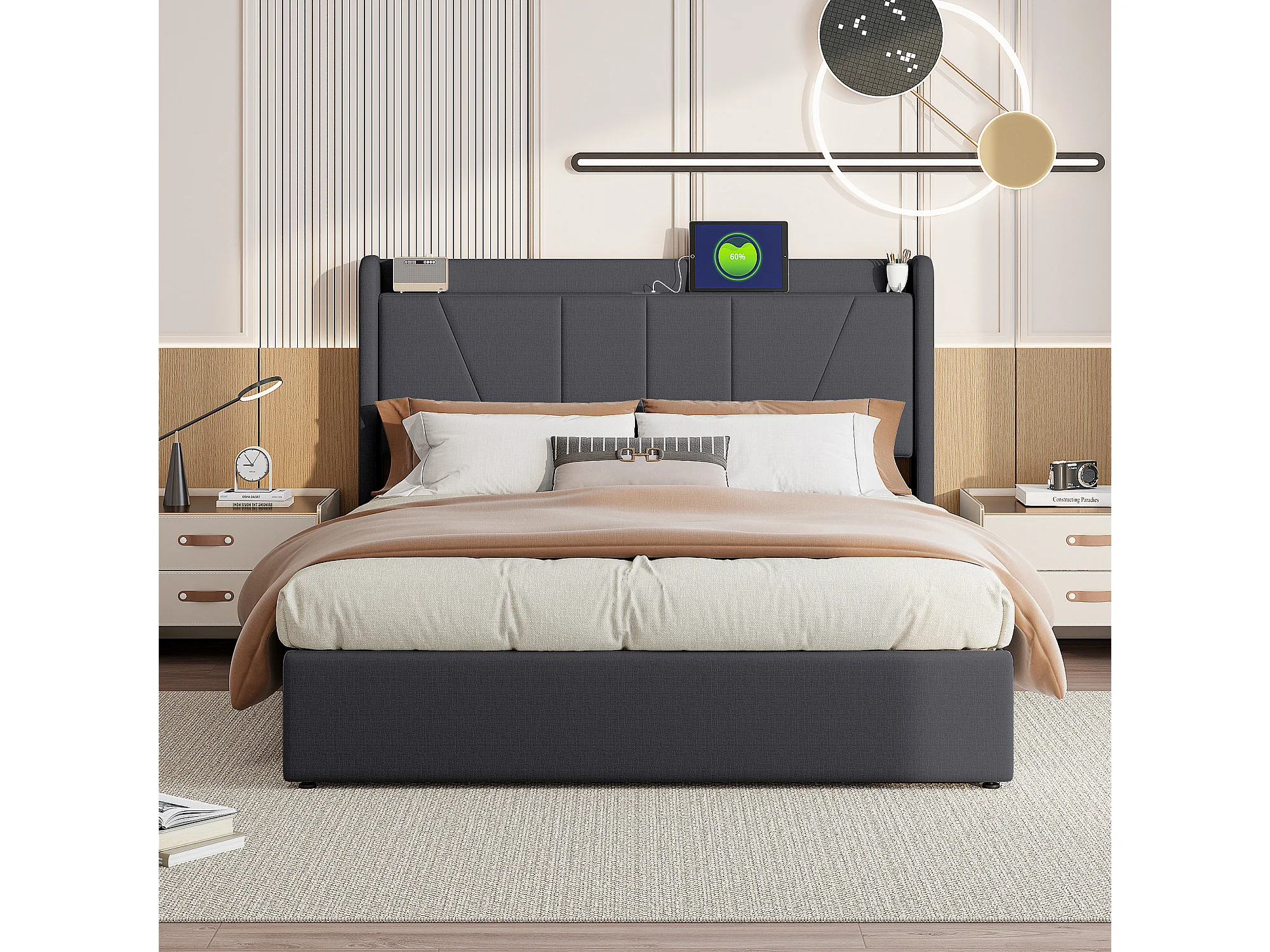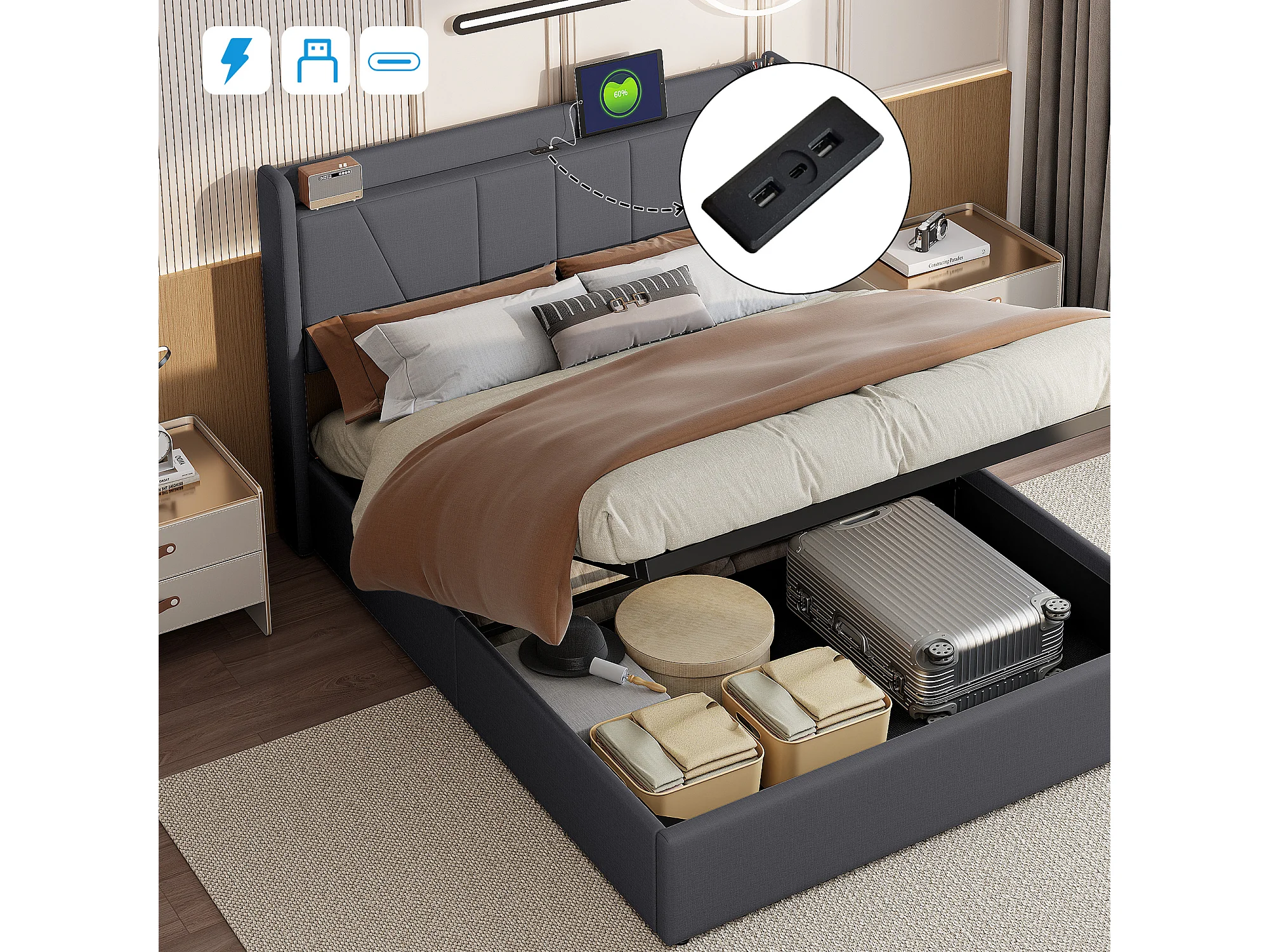 140 x 200 cm großes Stauraumbett mit LED-Beleuchtung, für 2 Personen, Leinenbezug, grau