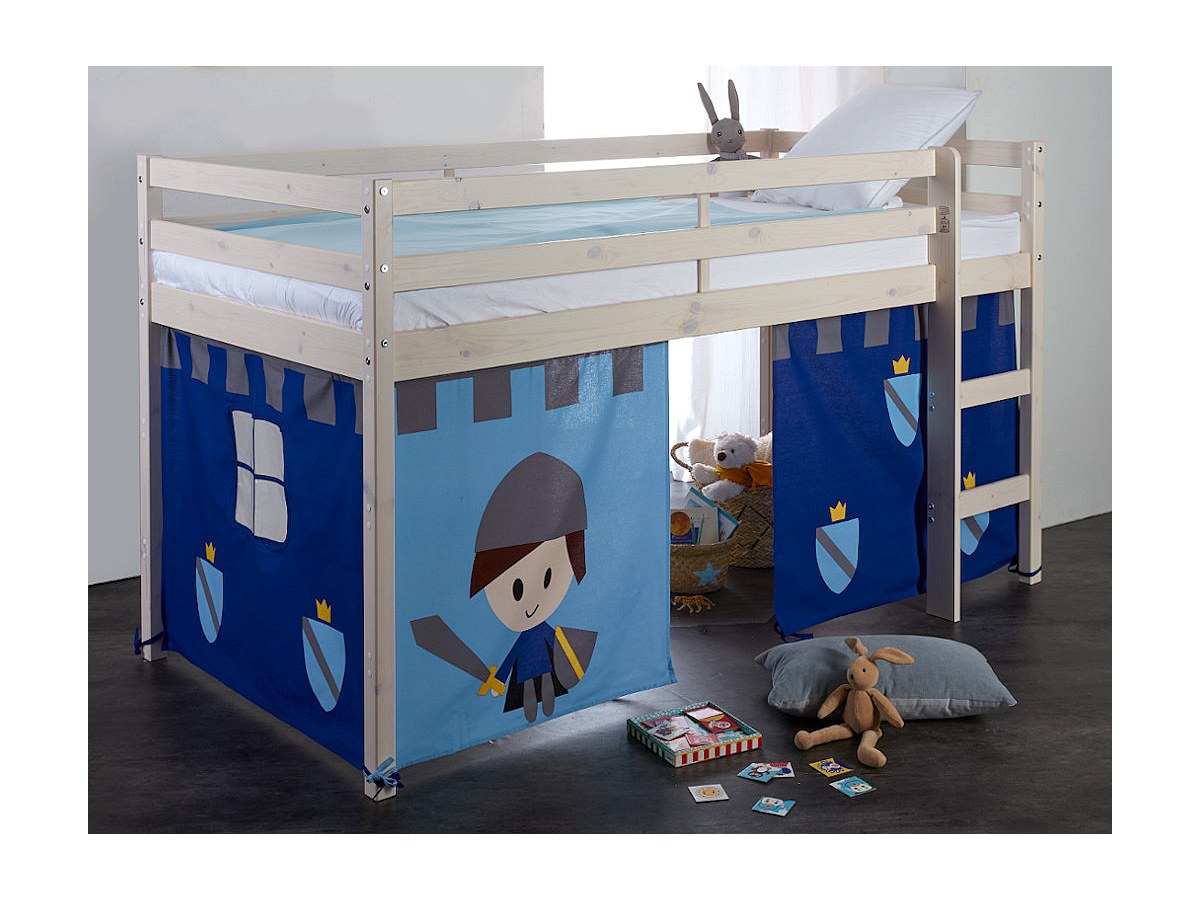 Halbhochbett LILIO - 90 x 190 cm - Kiefer massiv - Vorhänge Ritter blau