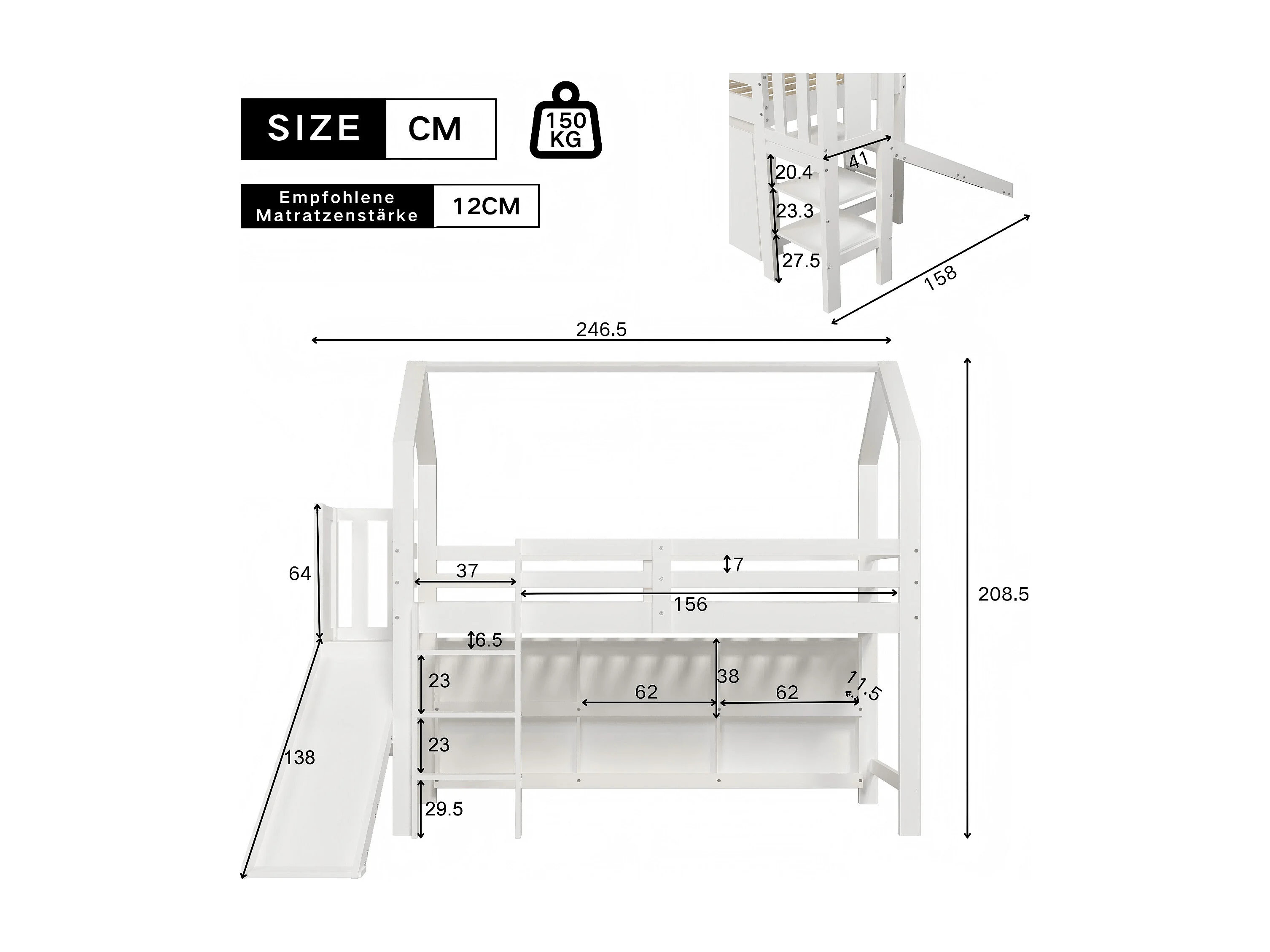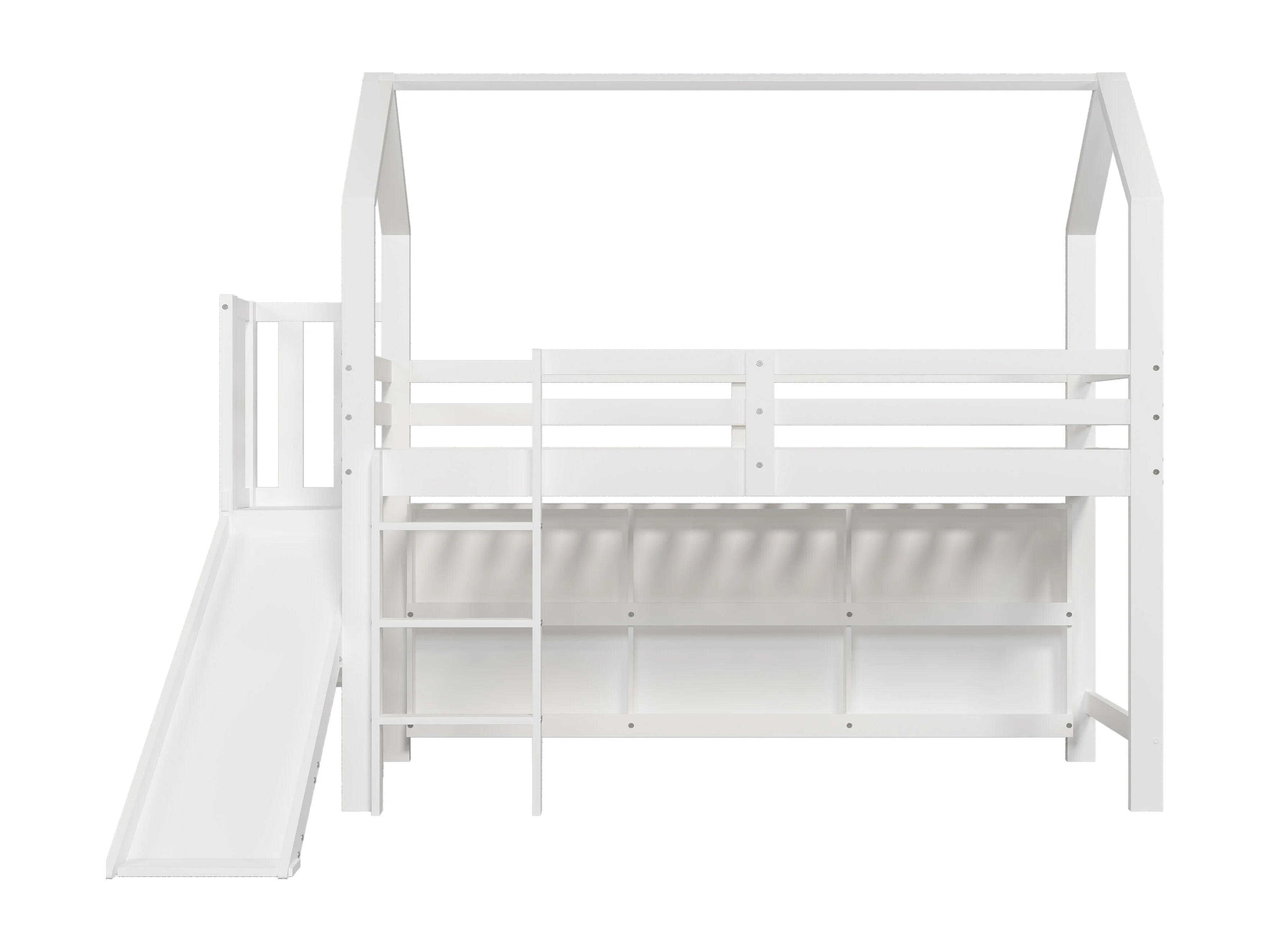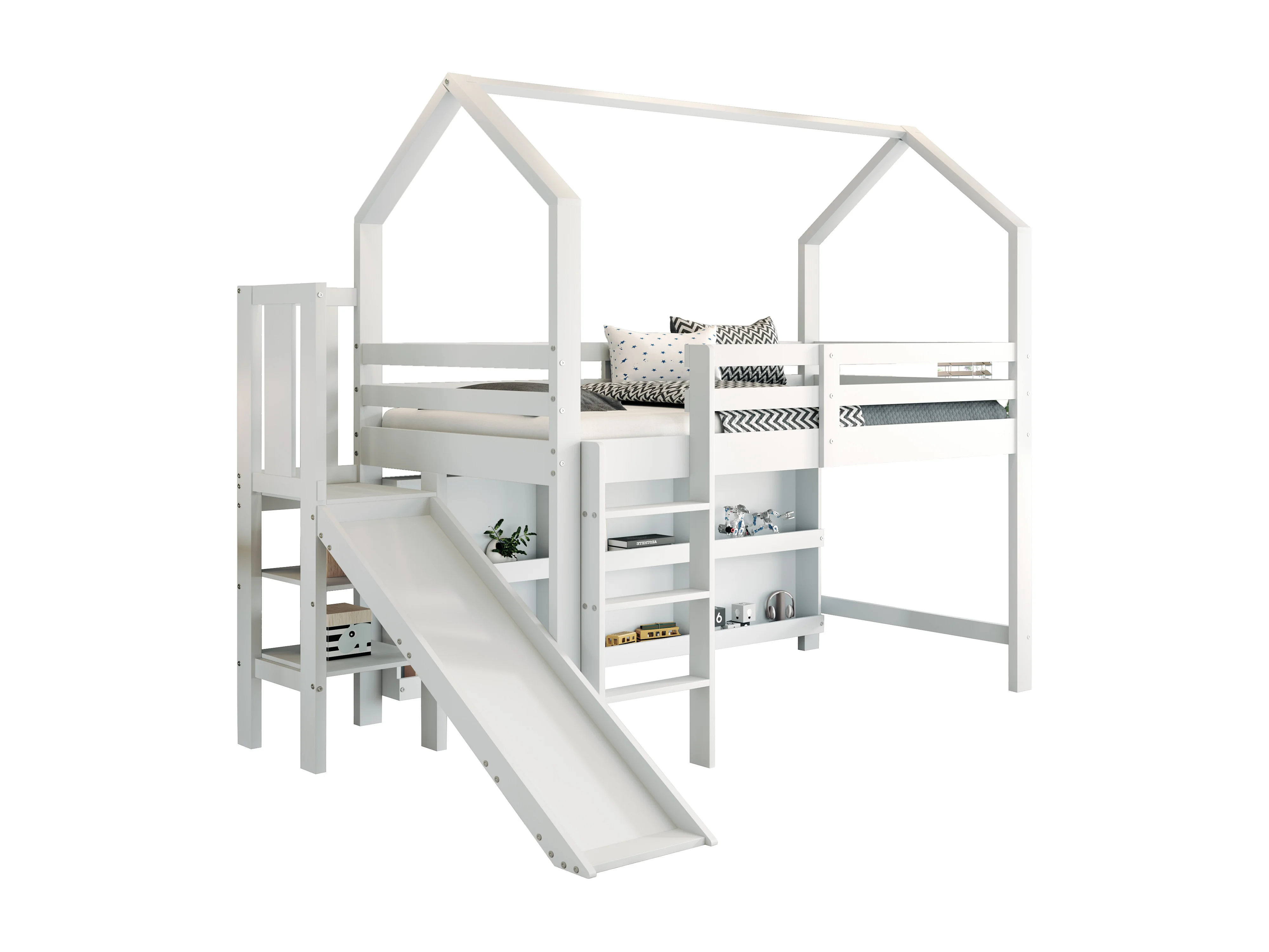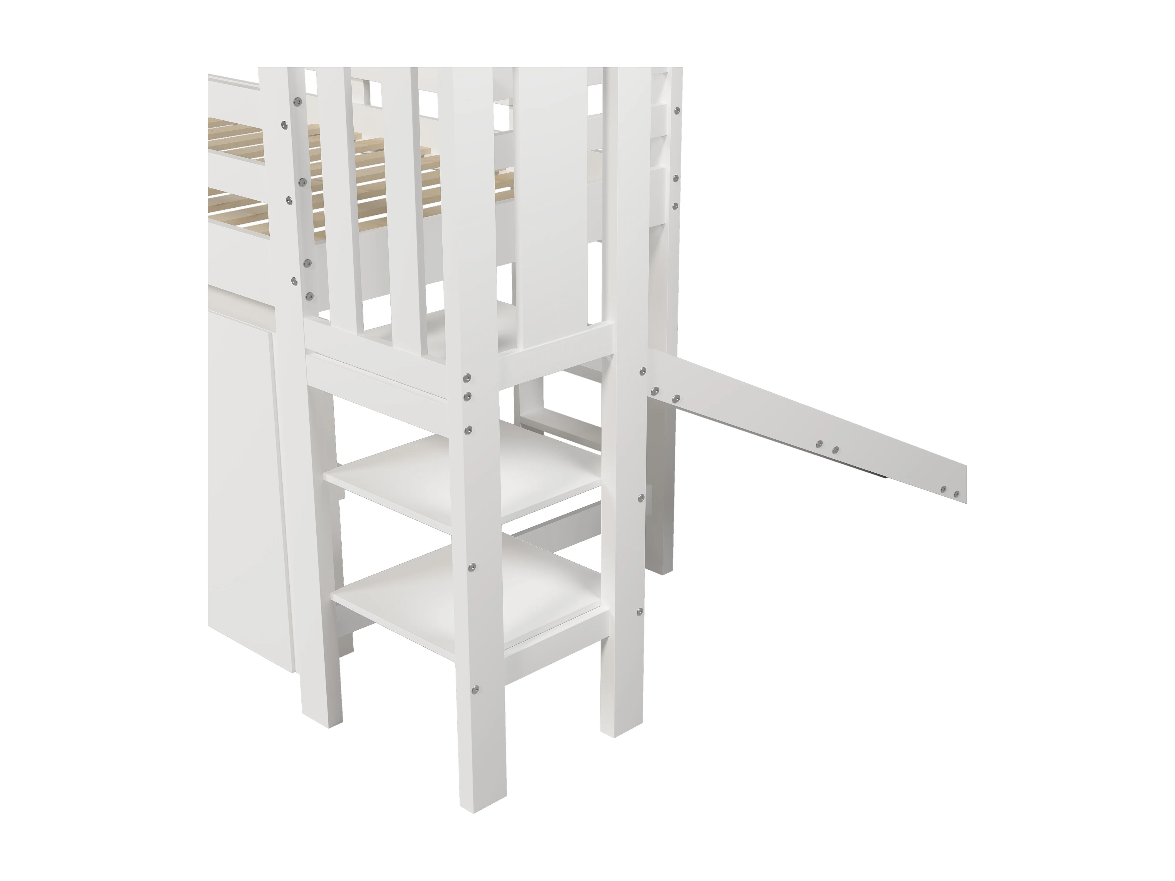 Hochbett 90x200cm – mit Rutsche + Treppe + Spind + Regal – aus Kiefernholz und MDF – Weiß