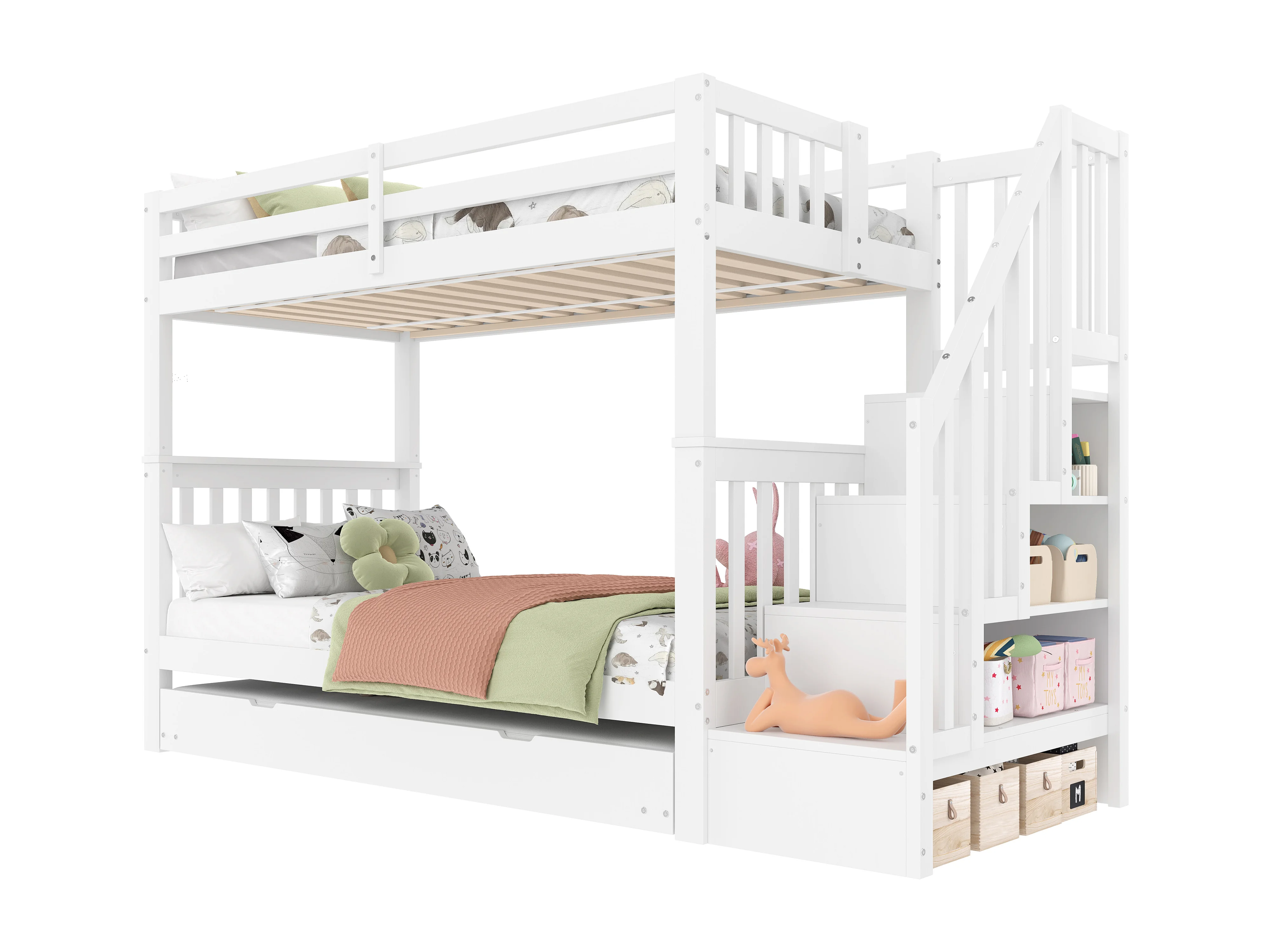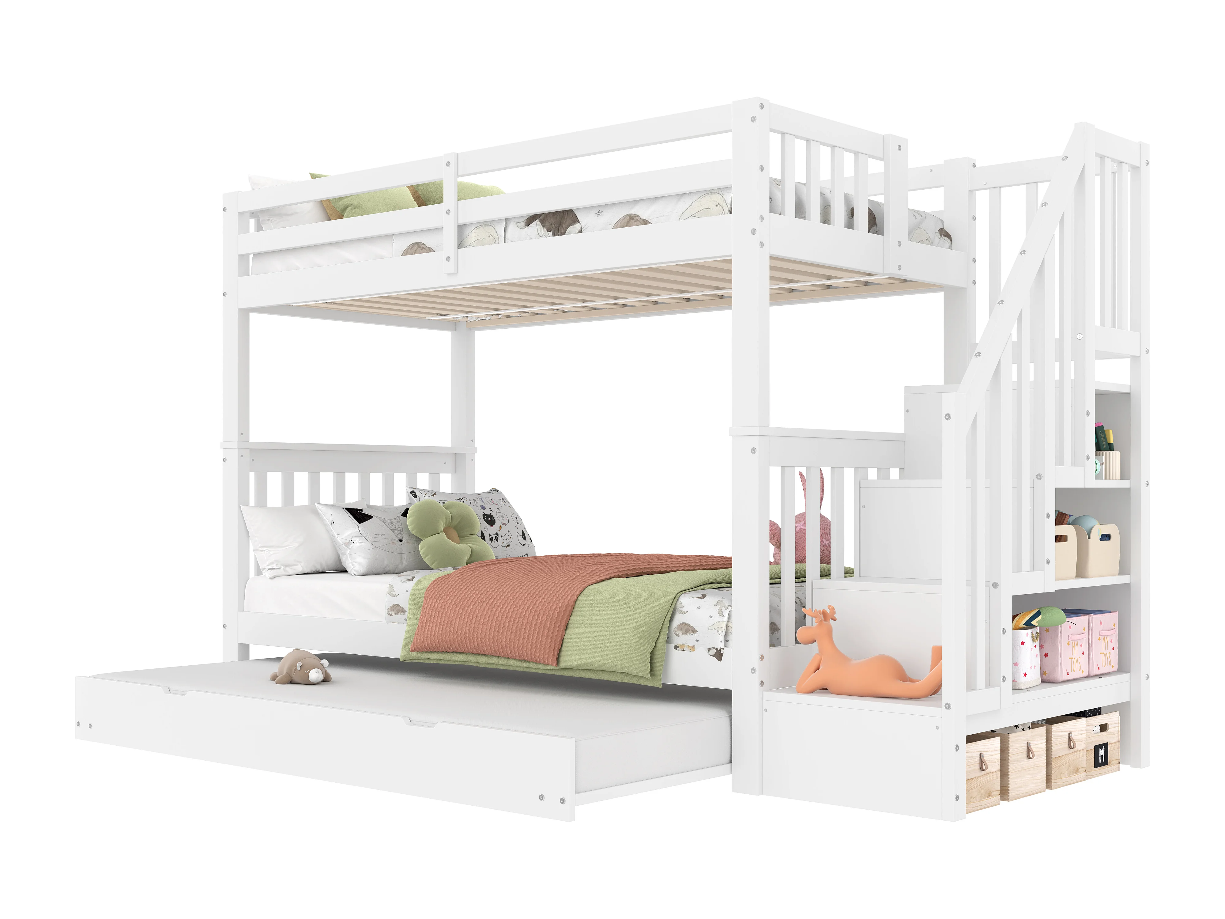 Kinderetagenbett 2 x 90 x 200 cm mit Ausziehbett 90 x 190 cm – mit Leiter und Stauraum – Holz – Weiß