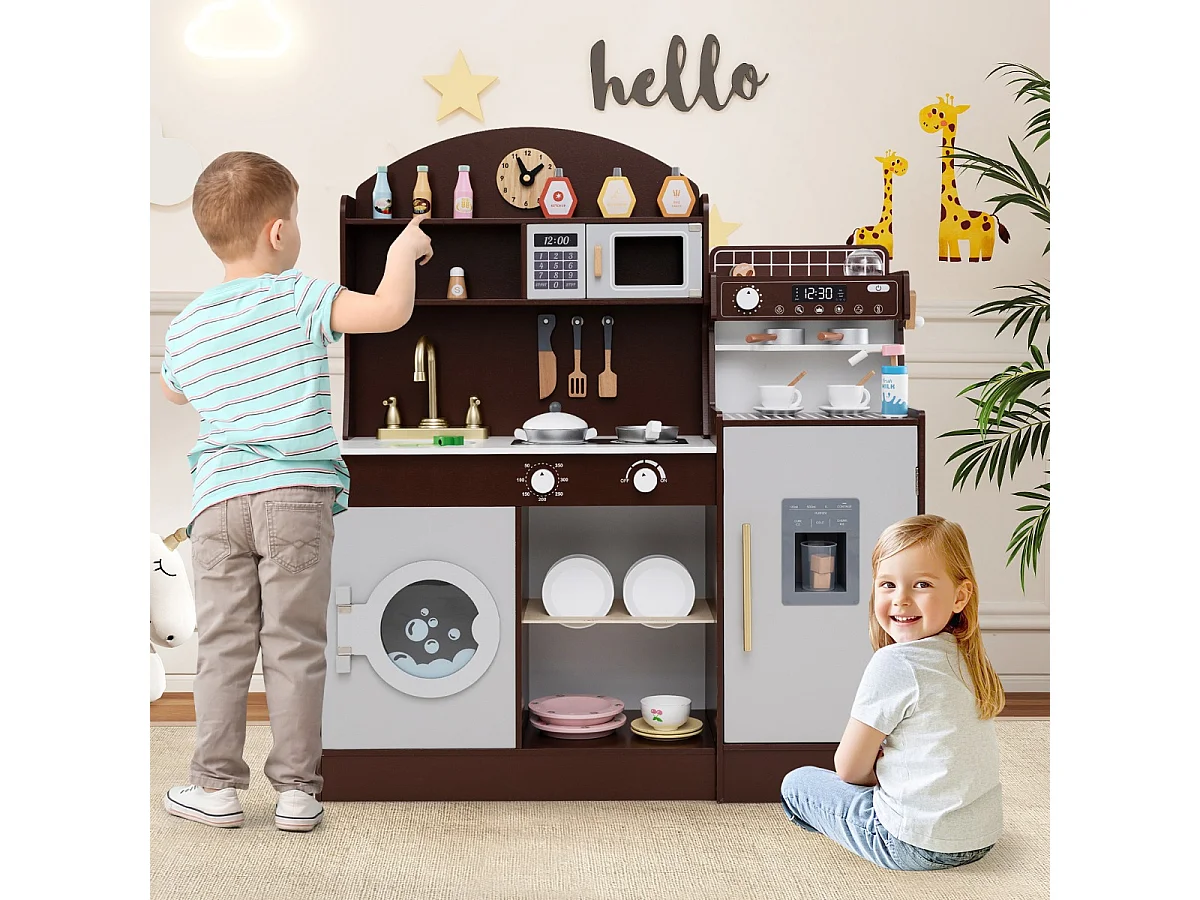 Küchenset SucceBuy für Kinder, Eck-Holzspielküche, Spielküchen-Spielzeug mit 24 Zubehörteilen, Braun