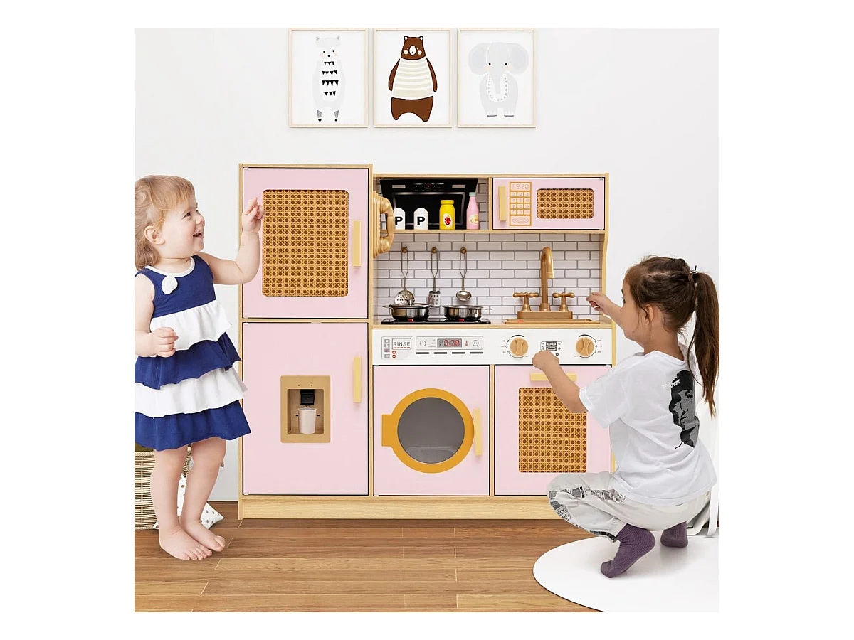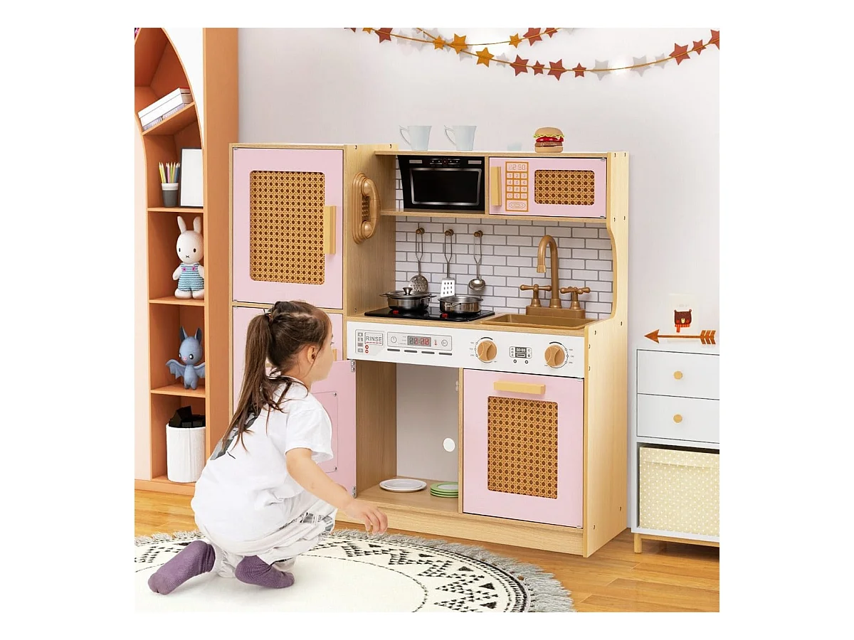 Kinderküche mit Rattantüren & Licht & Sound & Kühlschrank Spielküche Spielzeugküche Rosa