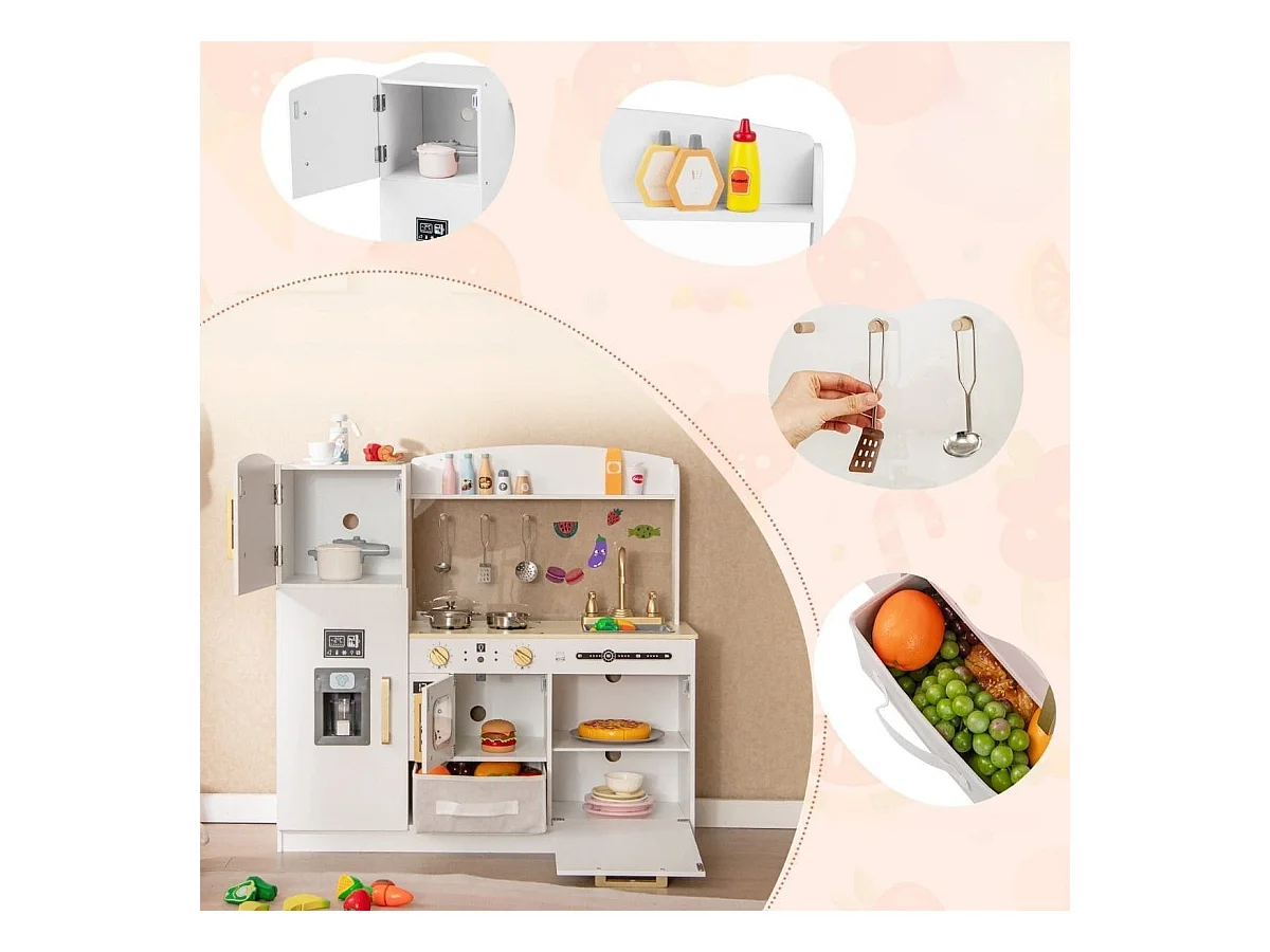 Küchenset SucceBuy für Kinder, Holzspielküche mit Lichter und Geräuschen, Spielküchen-Spielzeug mit 24 Teilen, Weiß