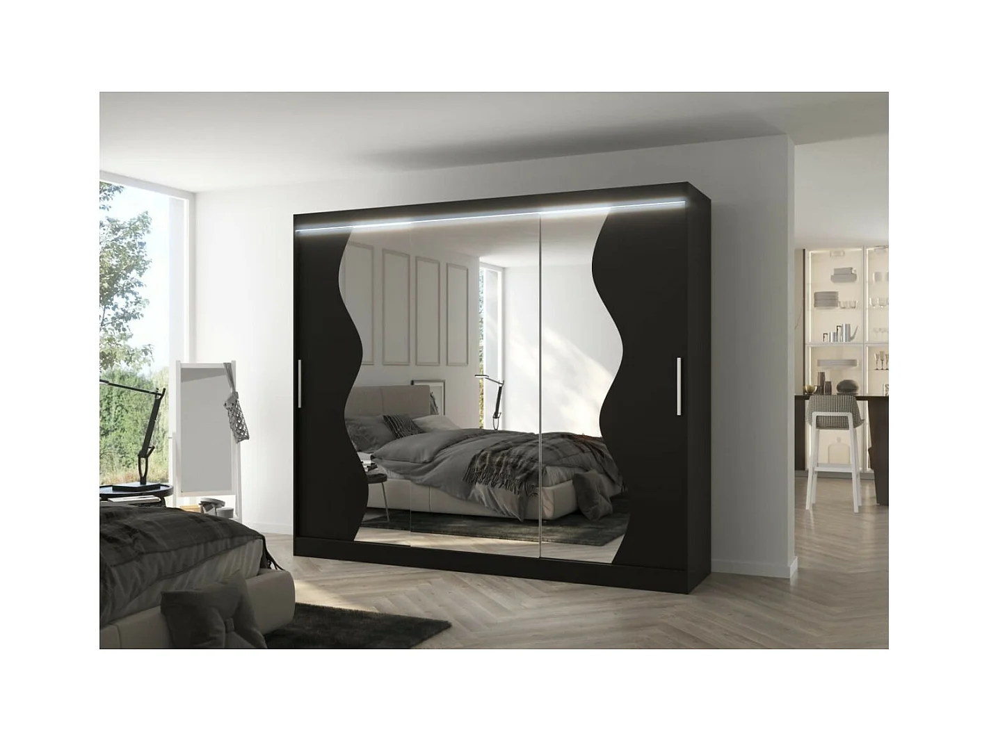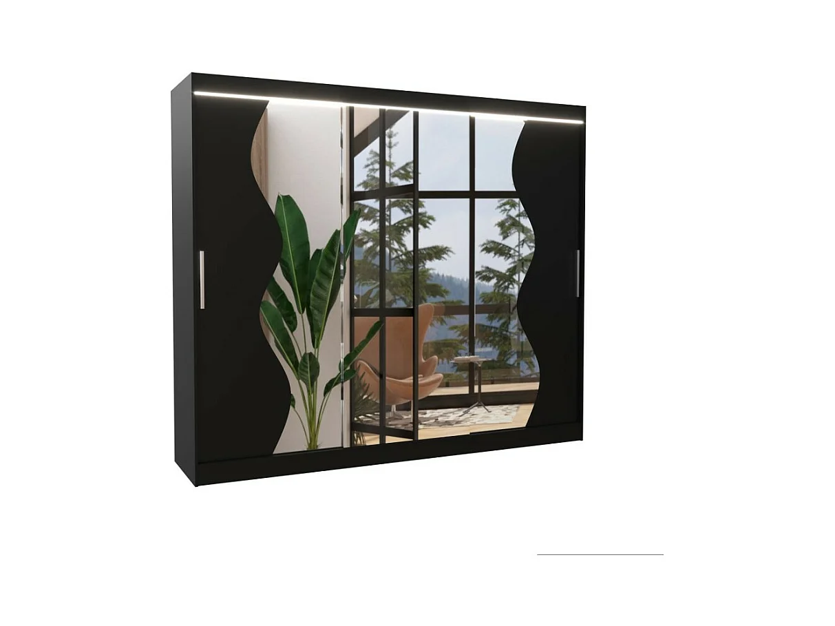 Kleiderschrank Haro (250cm)/Schiebetüren/LED/Spiegel/Schwarz